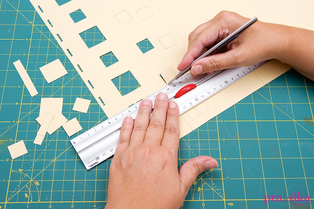 A törtfehér kartonpapírra rajzold fel a házsor körvonalát, az ablakokat, az ajtókat, valamint a piros rátétek helyét. A körvonal mentén ollóval vágd ki a háztömböt, az ablakokat vonalzó mellett, sniccerrel.