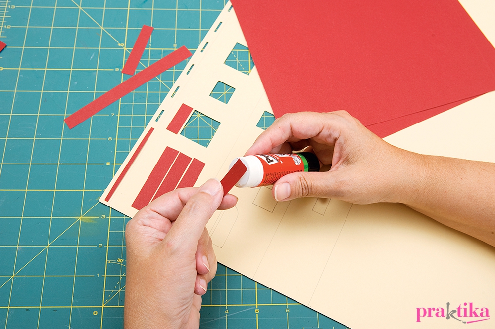 Rajzold piros kartonra a díszítőelemeket, az ajtókat. Ezeket ollóval vágd ki, és ragaszd fel a házsor megfelelő helyeire. Használj a rögzítéshez ragasztóstiftet. Vonalzó mellett, egy kés fokával kissé karcold meg a házak találkozása mentén a vonalakat. Ettől könnyebben és egyenesen tudod harmonikaszerűen meghajlítani a kartont. A középső elemtől jobbra és balra szimmetrikusan legyenek a cikcakkok.