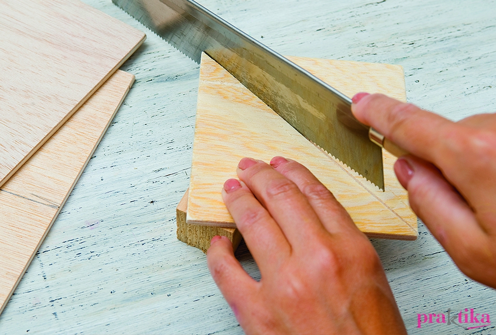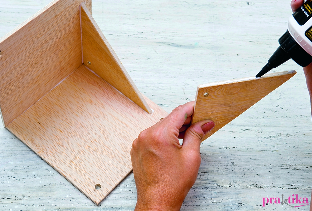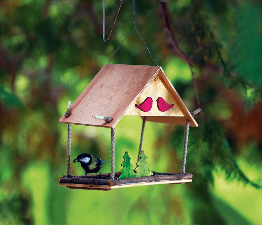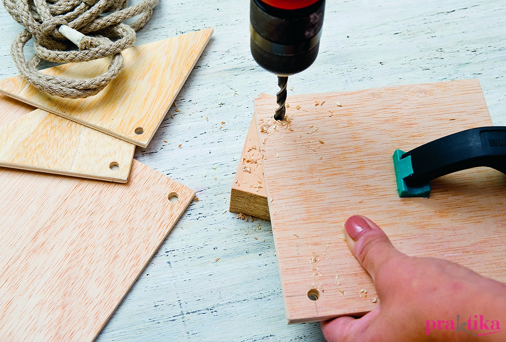 A négyzet alakú falapot átlóban fűrészeld ketté. Az egyik téglalapot keresztben ketté, a másikból egy 21x16 cm-es darabot vágj. Fúrd ki a lyukakat – 4-et az alja négy sarkába, kettőt-kettőt a két tető két egymás melletti sarkába, és egyet-egyet a háromszögek derékszögénél az akasztáshoz. Ragaszd össze a tetőt a gyorsan kötő faragasztóval – ügyelj arra, hogy a lyukak ne a gerinchez kerüljenek. Száradás után ragaszd fel a madarakat is a tetőre, amiket előtte ki is festhetsz.