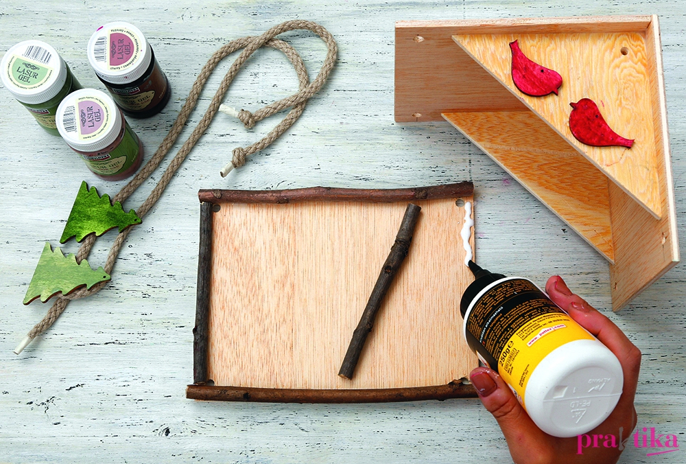 Hozzávalók • 12,5x12,5 cm falap • 2 db 16x32 cm falap • fűrész • expressz faragasztó • fafigurák – fenyők, madarak • zöld, bordó lasur paint • kötél, 2x65 cm • fúró •