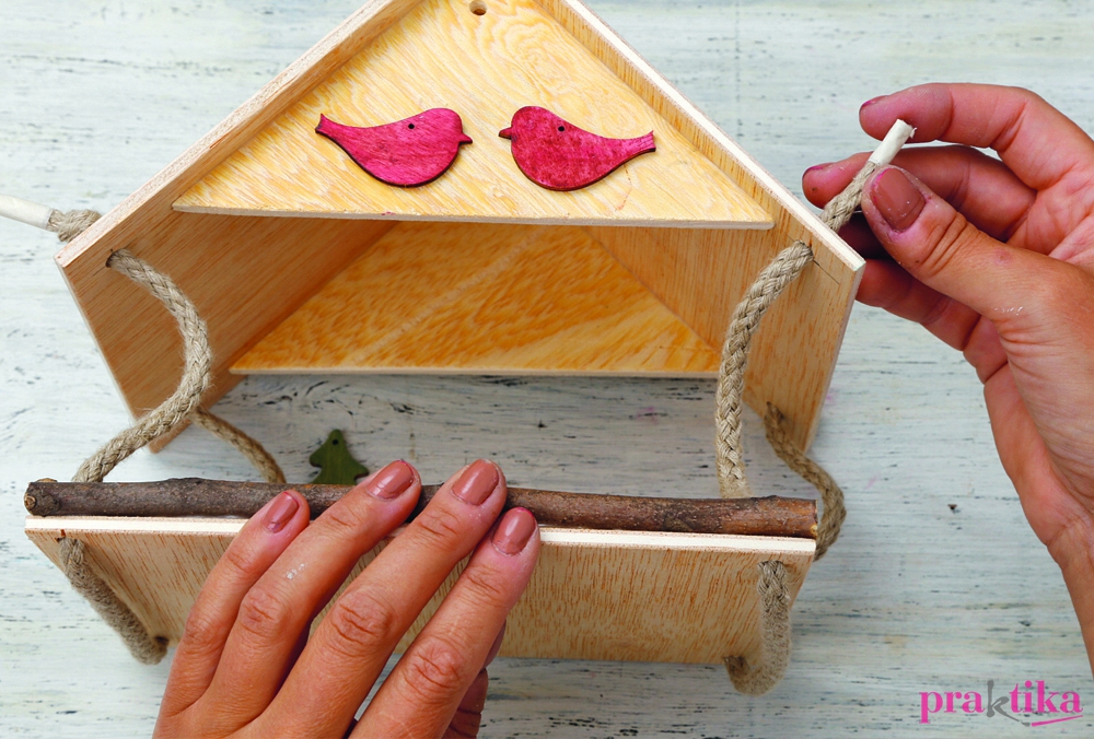 Az aljára vágj négy megfelelő méretű, egyenes gallyat metszőollóval, és ezeket is ragaszd fel a fa fenyőfácskákkal együtt. Bújtasd át a köteleket a megfelelő lyukakon és csomóval rögzítsd. Felül a tető háromszögén lévő két lyukba bújtass drótot, melyet felül hurkolj össze, és ezzel akaszd az etetőt a fára.