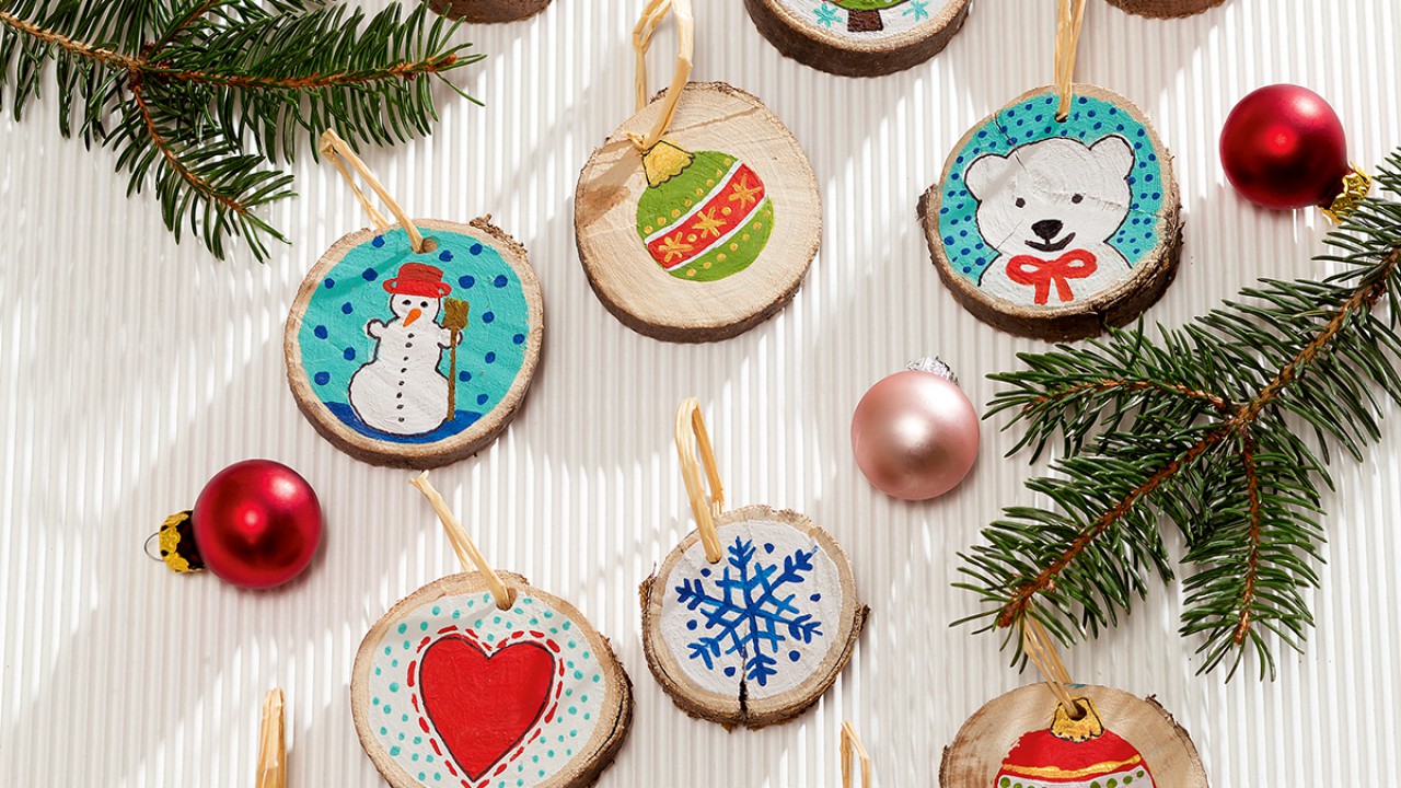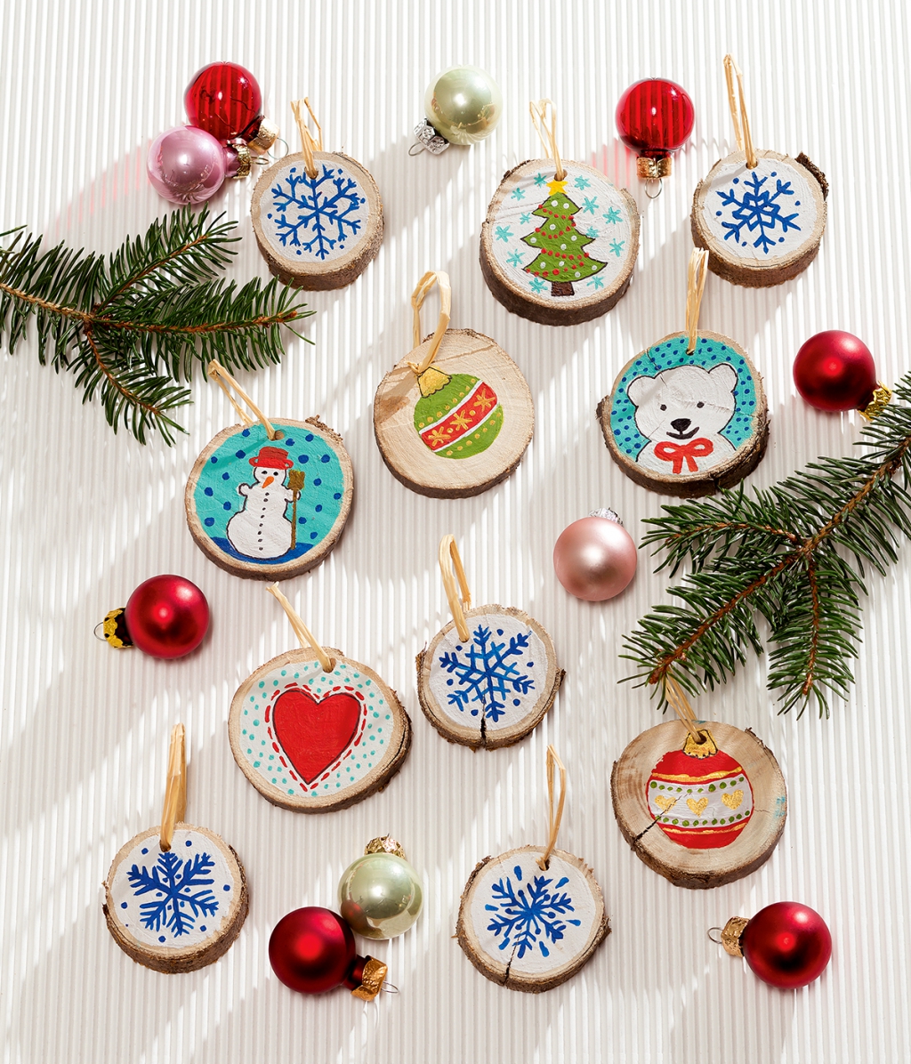2. Hobbiboltból is beszerezheted, de akár apu is segíthet az előkészítésben, ha 4-5 cm átmérőjű faágat felszeletel, és mindegyik korongra lyukat fúr az akasztónak. Máris lehet ceruzával felrajzolni a karácsonyi motívumokat, és vehetitek elő a festékeket, ecseteket. Dolgozhattok temperával vagy akár alkoholos filctollal is, de a legszebb eredményt akrilfestékkel érhetitek el. A hópelyhekhez fehérrel fessétek meg az alapot, és száradás után jöhet a kék szín. Ehhez használjatok vékony ecsetet. Végül fűzzetek akasztót a díszekbe.