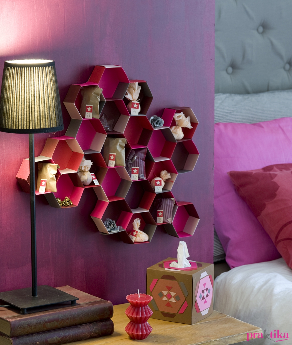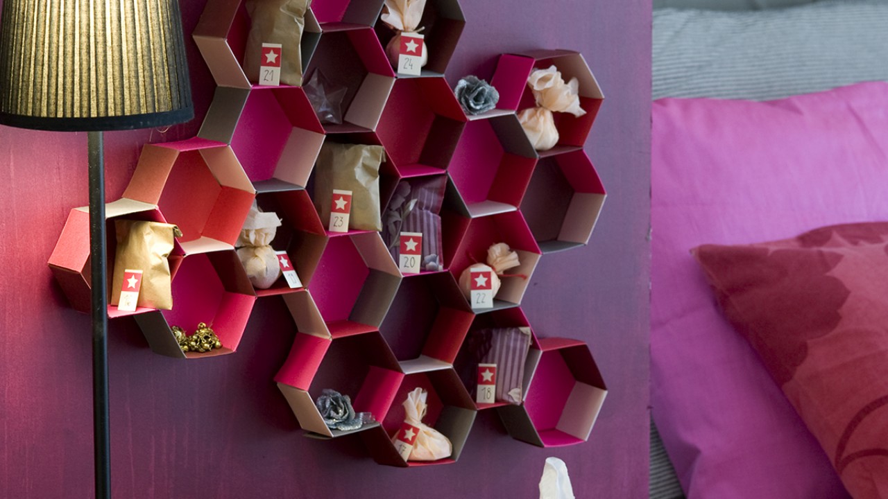 A méhsejt falipolc két fölső hatszögének alját lyukaszd át, és szöggel vagy csavarral rögzítheted a falra. Adventkor tehetsz mindegyikbe egy-egy bonbont, év közben apró tárgyakat.