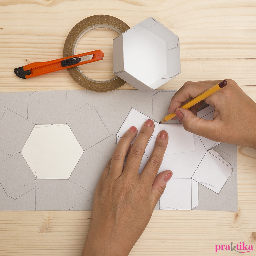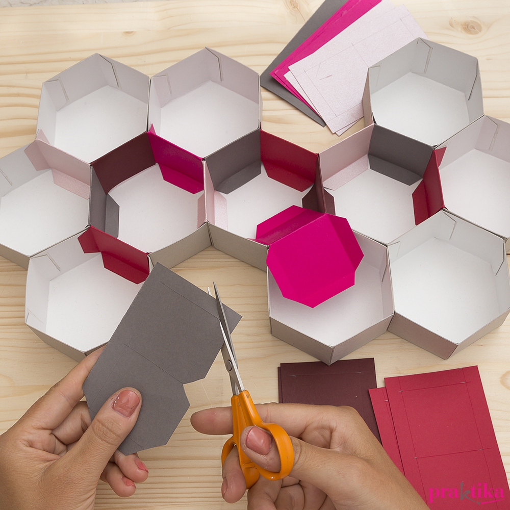 A színes papírokból vágj 9×6,5 cm-es csíkokat. A hosszanti oldalaktól 1 cm-re karcold be, a rövidebbektől 1, majd 4,5 cm-re. Vágd le a sarkokat, és keresztben félbehajtva egy-egy csík ragasztószalaggal borítsd be a papírokkal a szomszédos hatszögek oldalait. Idővel láthatod, hogy ahol már van fül a következő oldalhoz, ott le kell vágnod a következő színes elemről a megfelelő fület. Végül vágj 20 hatszöget a színes kartonokból, és ezeket ragaszd a dobozok aljába.