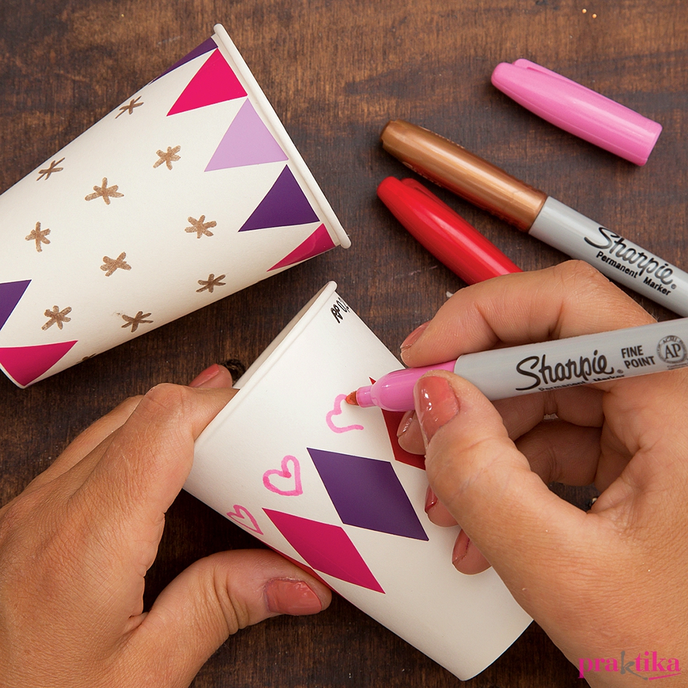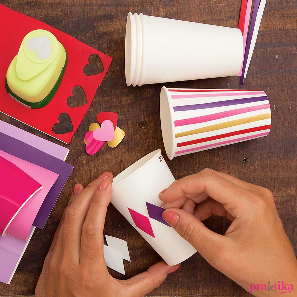 Az öntapadó fóliákból vágj ki karcsú háromszögeket, keskeny csíkokat, rombuszokat és a lyukasztóval szíveket. Díszítsd fel velük a poharakat, minél változatosabban. Inspirációnak használd az előző oldalon látható fotót. A további apró mintázást a színes filctollakkal már szabadkézzel rajzolhatod fel az üres részekre.