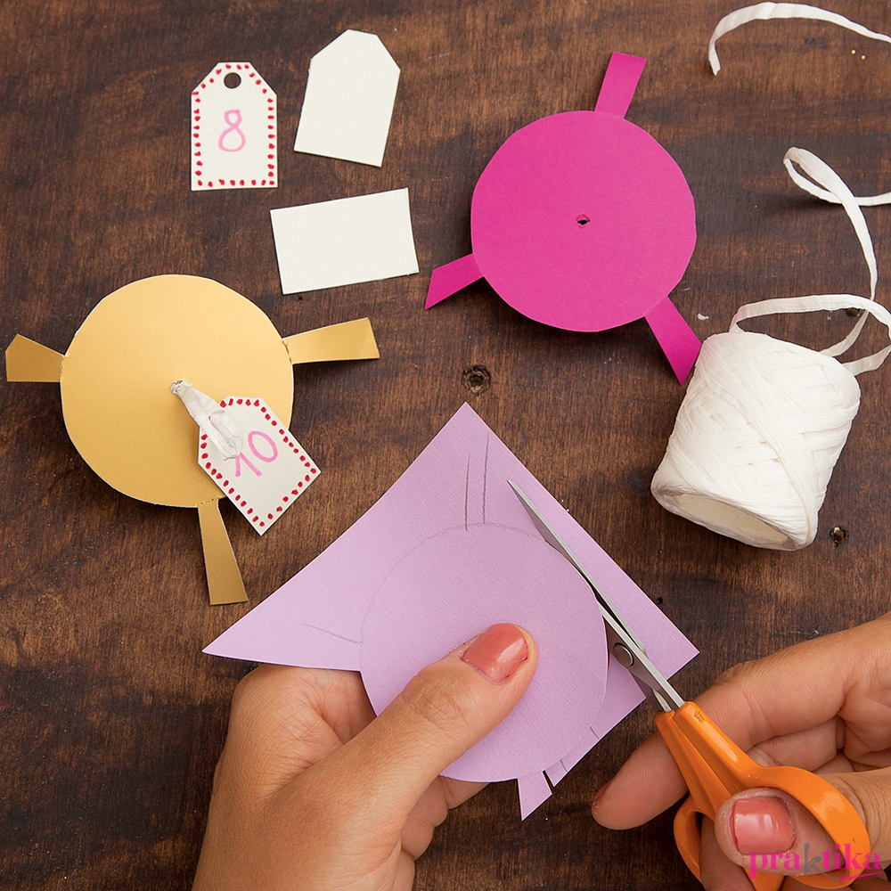 Sablonnal rajzolj a színes kartonokra a pohár szájánál kicsit kisebb korongokat három füllel, és vágd ki azokat, ezekből lesznek a fedők. Készítsd el a kis címkéket is, és pöttyözd a szélüket filctollal, majd írd rá a számokat. A fedő közepét az olló hegyével bökd át. Egy címkét húzz fel egy darab kötözőszalagra, hajtsd félbe, bújtasd át a két véget a fedőn, és alul csomózd meg. Tedd az ajándékot a pohárba, hajtsd le a tető füleit és zárd le a poharat. A füleket be is ragasztózhatod, mielőtt befeded vele a poharat.