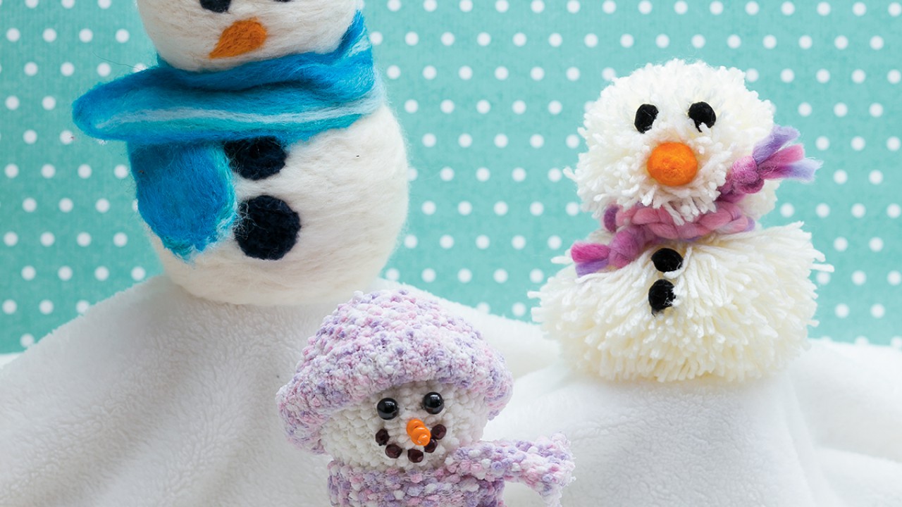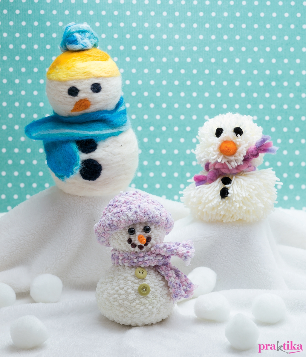 A nagyobb gömbről vágj le két szeletet. Alul, hogy megálljon a talpán, felül, hogy a fejét rá tudd majd ragasztani. A kisebbről csak egyet vágj le. Fehér gyapjúval borítsd be mindkettőt, és lazán nemezeld rá a tűvel, a levágott részeket szabadon hagyva. Végül ragaszd a kisebb gömböt a nagyobbra. A szemet, orrot, gombokat színes gyapjúból szurkáld a megfelelő helyekre. Próbáld pontosan, éles kontúrral alakítani a formákat. Nemezeld a sapkát a fejre, a rajta lévő pompon egy laza gyapjúgolyó legyen. A sálat külön készítsd el, a szivacsalapon, majd tekerd a hóember nyakába.