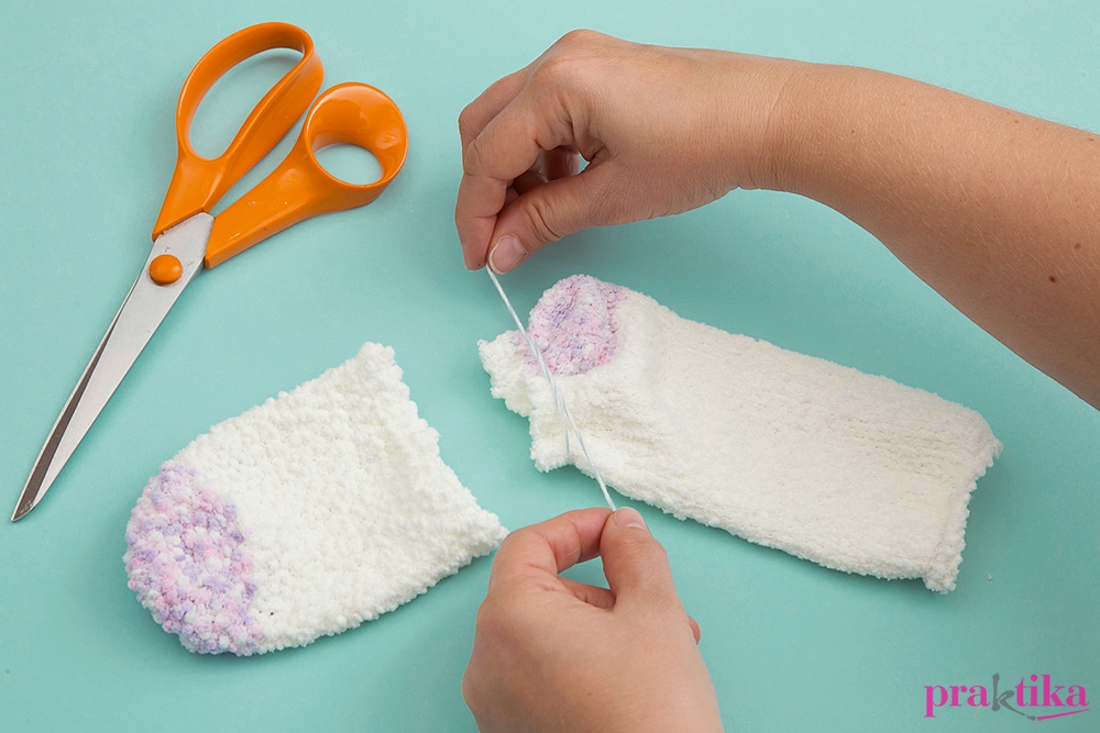 Hozzávalók • puha zoknik • tömőanyag • fonal • gyöngyök • gombok • olló • tű • cérna •