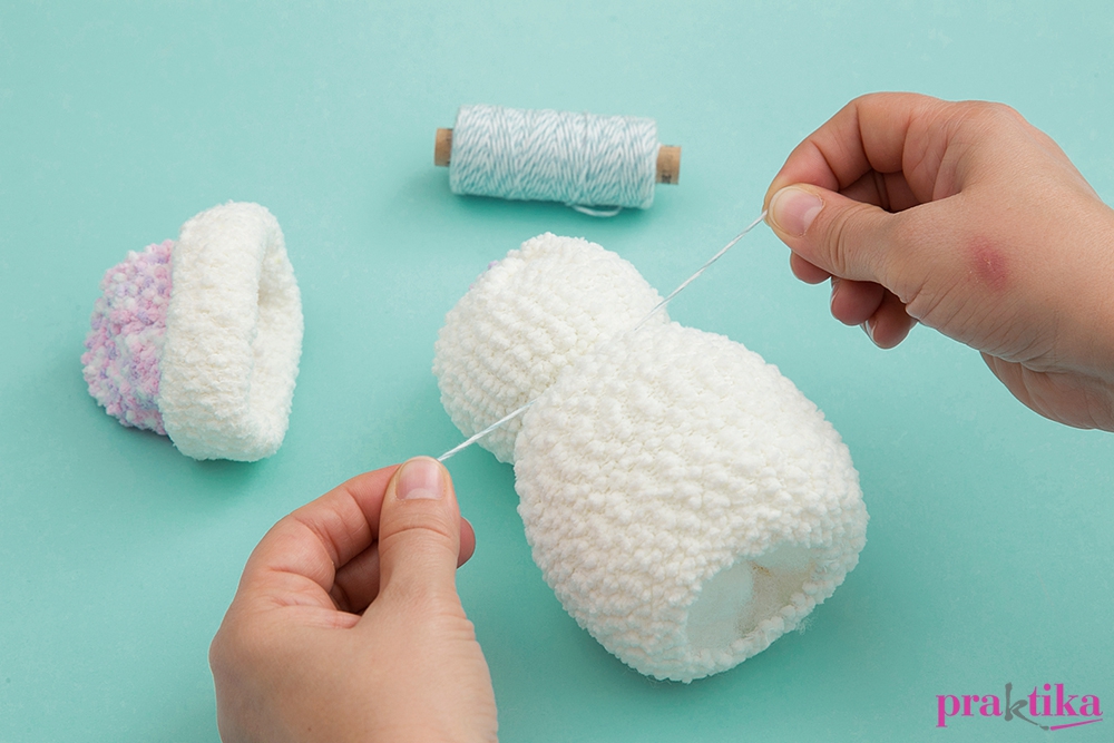 Ezt elkészítheted más színű zokniból is, aminek nincs már meg a párja.Tömd ki a testet és kösd el azon a helyen, ahol a hóember nyaka lenne (B). Az alját fércöltéssel varrd körbe és húzd szorosra. Varrj rá gyöngyből szemeket, szájat és orrot. Az orrhoz ölts az anyagba, fűzz fel két nagyobb és egy kisebb kásagyöngyöt, majd ölts vissza a nagyobbakon. Varrj fel két gombot dísznek, és kanyaríts a sapka színével harmonizáló sálat is a nyakába.