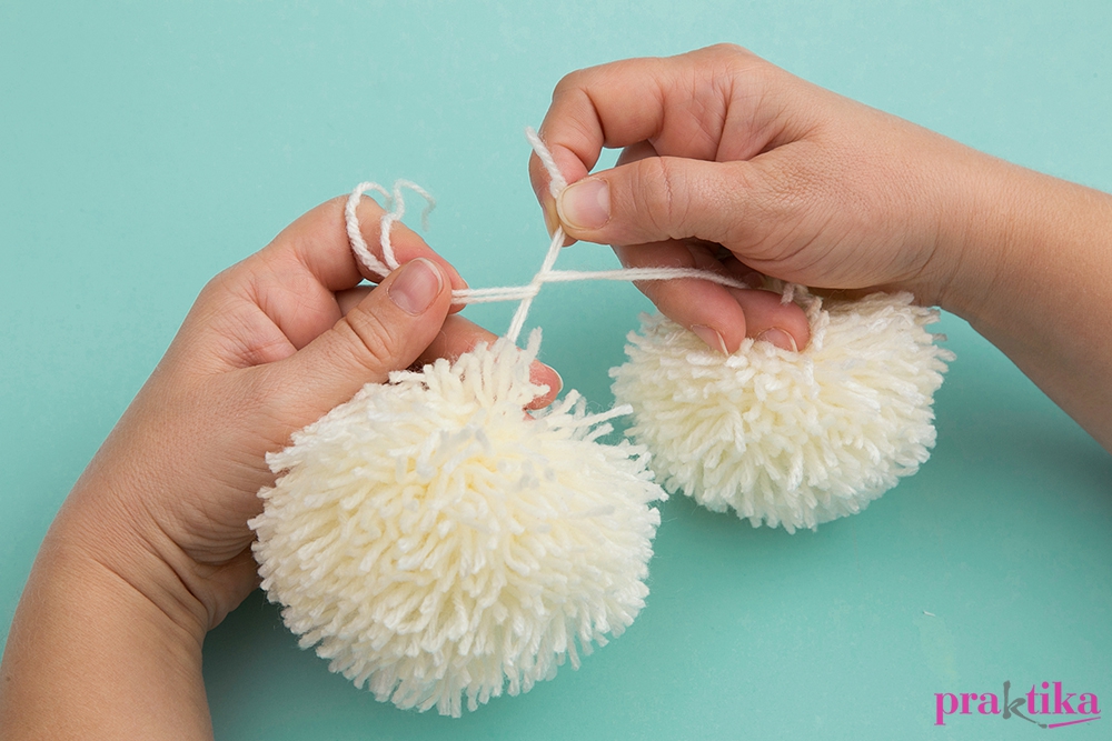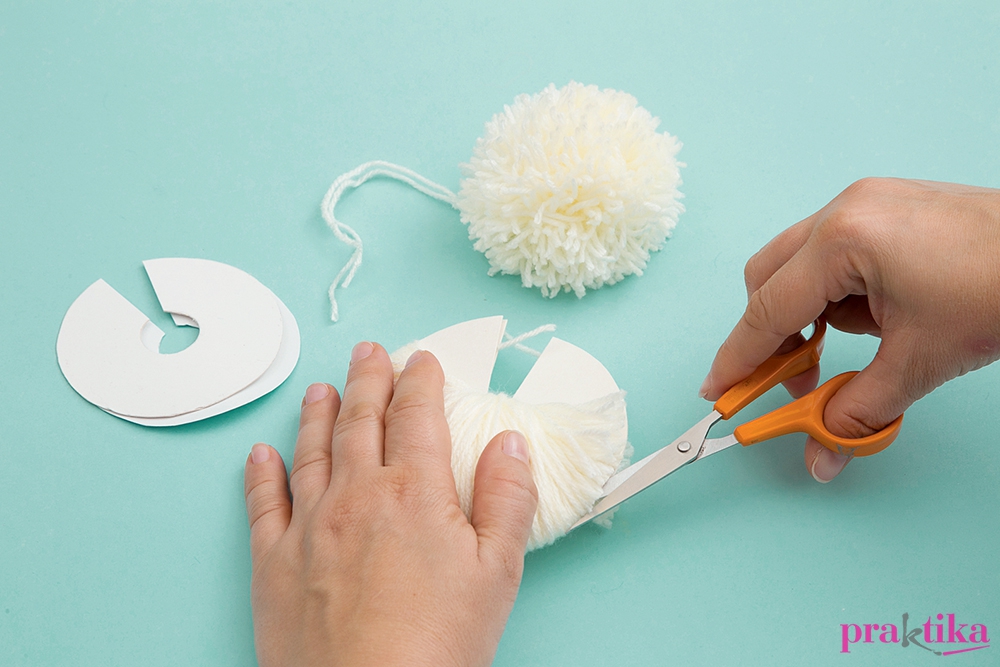 A sablonokat vágd ki duplán jó tartású kartonból. Fogj össze kettőt úgy, hogy közéjük fektetsz egy szál fonalat, ezzel kötheted el a pompont. Tekerj a korongra bőven fonalat, majd óvatosan vágd el a szálakat. Húzd szorosra a kötözőszálat és csomózd meg. Ollóval gömbformára igazíthatod. Készítsd el a másik pompont is. Csomózd egymáshoz a két szálat. Szemeknek és gomboknak ragassz zseníliapomponokat. Az orr gombócát vágd kicsit kúposra, mielőtt felragasztod. A sálat vastagabb, színes fonalból, hármas fonással készítheted el.