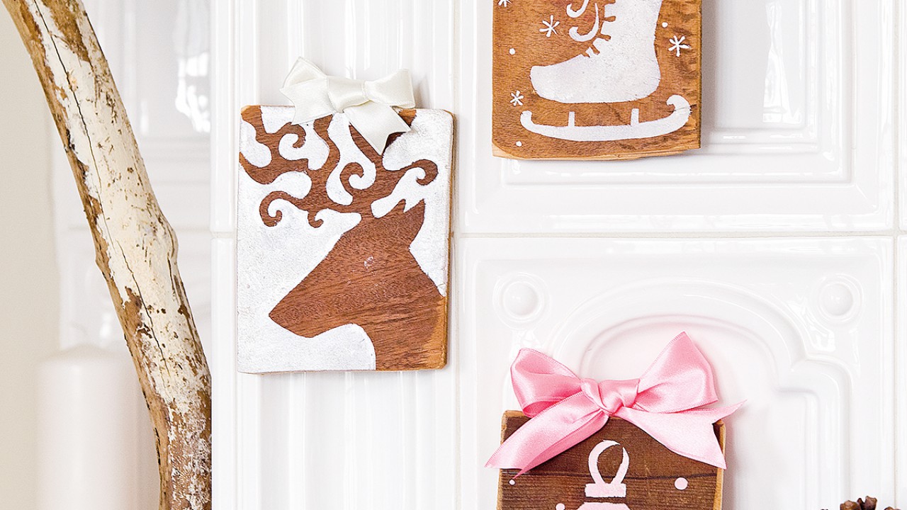 A fa szabadon maradt részeire szivaccsal tunkold rá a festéket. Ha megszáradt, lehúzhatod az öntapadó fóliát. Ecsettel tetszés szerint festhetsz a minta köré még hópelyheket, pöttyöket.