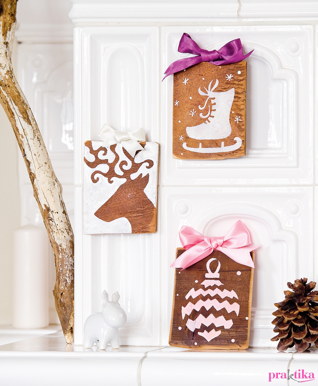 A faképecskét felakaszthatod, ha a felső élébe, középre képakasztót csavarsz be. Ennek a tövébe dísznek köss a szaténszalagból masnit.