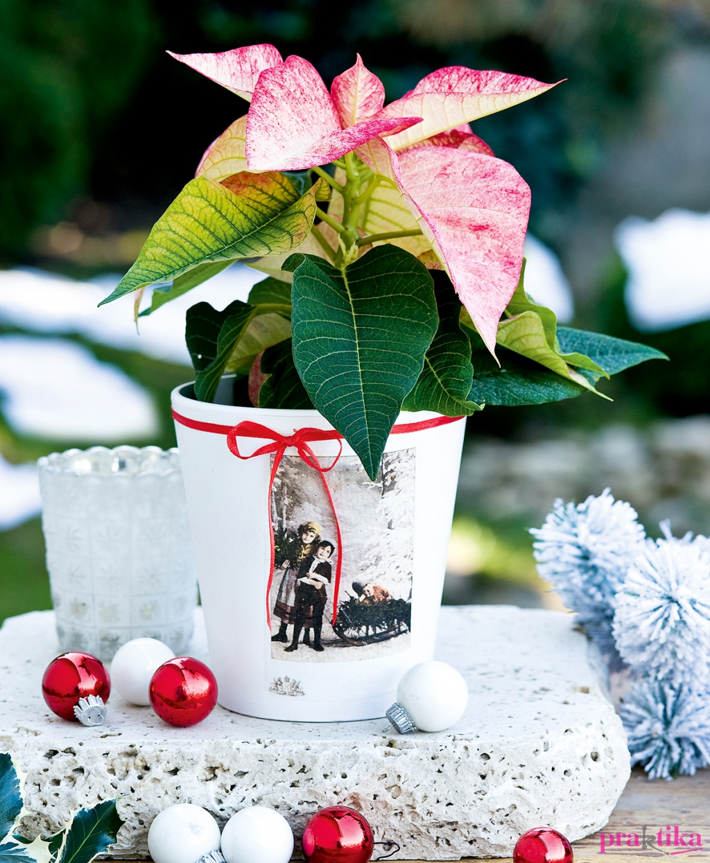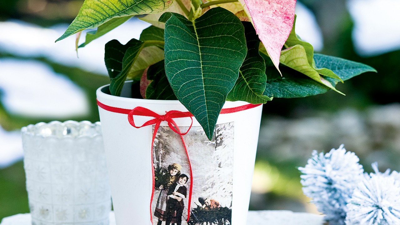 A képeslapról készíts fénymásolatot, ha szalvétád van, húzd le a legfelős, mintás rétegét. Fújd le a kaspót fehérre, és ha megszáradt, a megfelelő méretűre vágott másolatot dekupázsold fel az oldalára. Felülről is kend át a ragasztóval, hogy strapabíróbb legyen. A piros szalagot néhány helyen kétoldalú ragasztószalaggal rögzítsd a kaspóhoz, majd kösd masnira. A téli hangulathoz jól jöhet még egy mikulásvirág is.