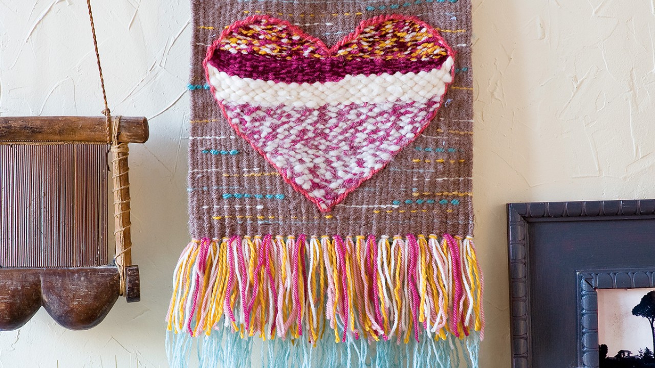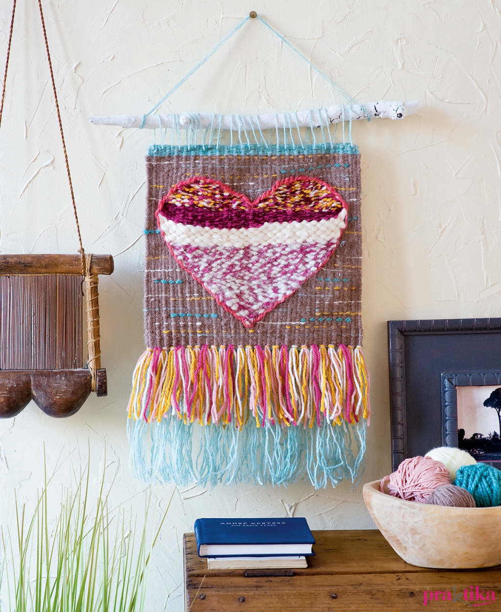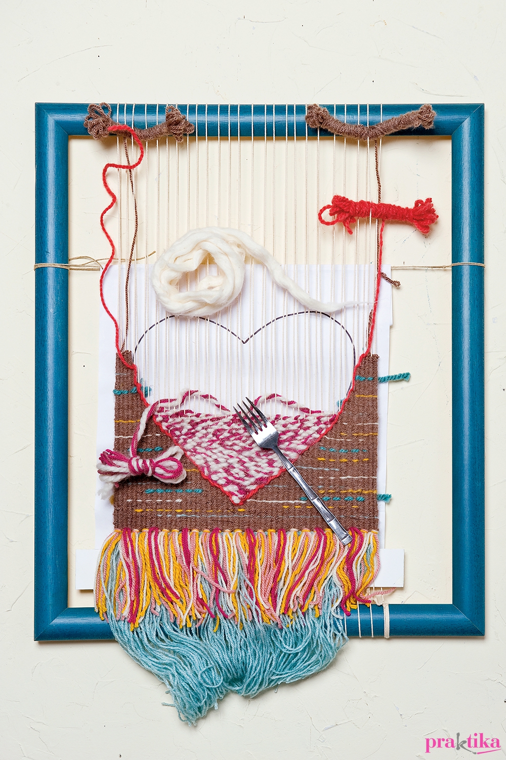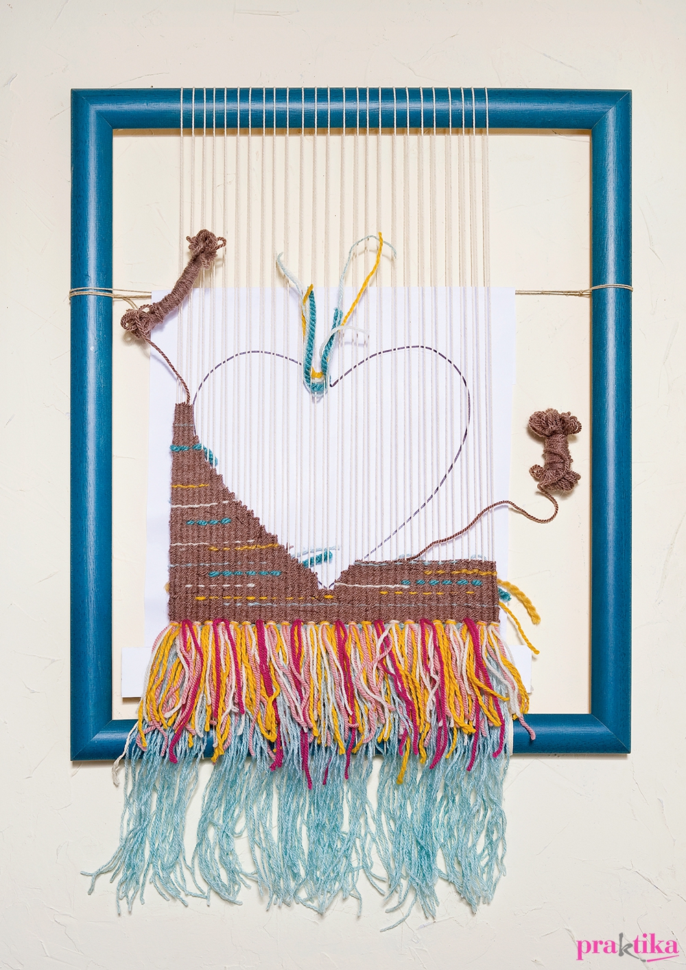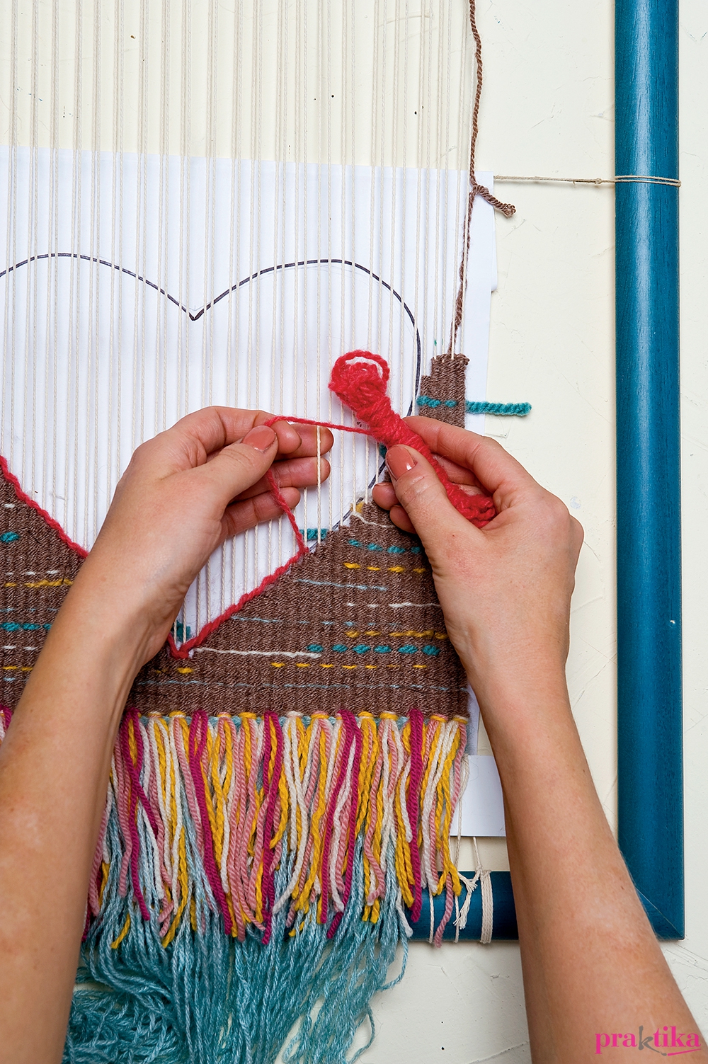 Vágj kartonpapírból egy 32×4 cm-es csíkot, fent bújtasd a szálak közé, és nyomd le a keret aljához a szálkereszteződéseket. Csomózd meg kettesével a szálakat egy darab felvetőfonallal. Szőj körülbelül 10 sort a világoskék fonallal: a felvetőszálak között föl-le bújtasd a kék fonalat, a sor végén fordulj vissza, és most az ellenkező ritmusban haladj a szálak között a fonallal. Ezt ismételd soronként oda-vissza. Figyelj, hogy a széleket ne húzd össze, az oldalak párhuzamosak maradjanak. Időnként tömörítsd össze a szövést egy villa fogaival. Vágj 75 darab, 50 cm-es szálat, és hármasával csomózd a felvetőszálakra. Szőj további 10 sort, és most színes szálakkal készíts egy rövidebb rojtsort, ugyanezzel a csomózási technikával. Folytasd a szövést a háttérszínnel, és itt-ott válts színt rövid szakaszokon, majd folytasd a háttérszínnel. Ha kész van egy 3 cm-es sáv, rajzold a szívmintát papírra, és rögzítsd a szövés mögé – lent varrd a szövéshez, felül pedig egy keresztben kikötött felvetőszálra hajtsd rá a papírt. A kontúrvonalat követve töltsd fel a háttérszínnel a bal, majd a jobb oldalt is, amíg a szív szélessége nő. Kényelmesen szőhetsz, ha fonalbabákat készítessz hozzá. Mindegyik színű szálból hurkolj nyolcasokat a hüvelyk- és a kisujjadon, majd keresztben is tekered át a köteget.