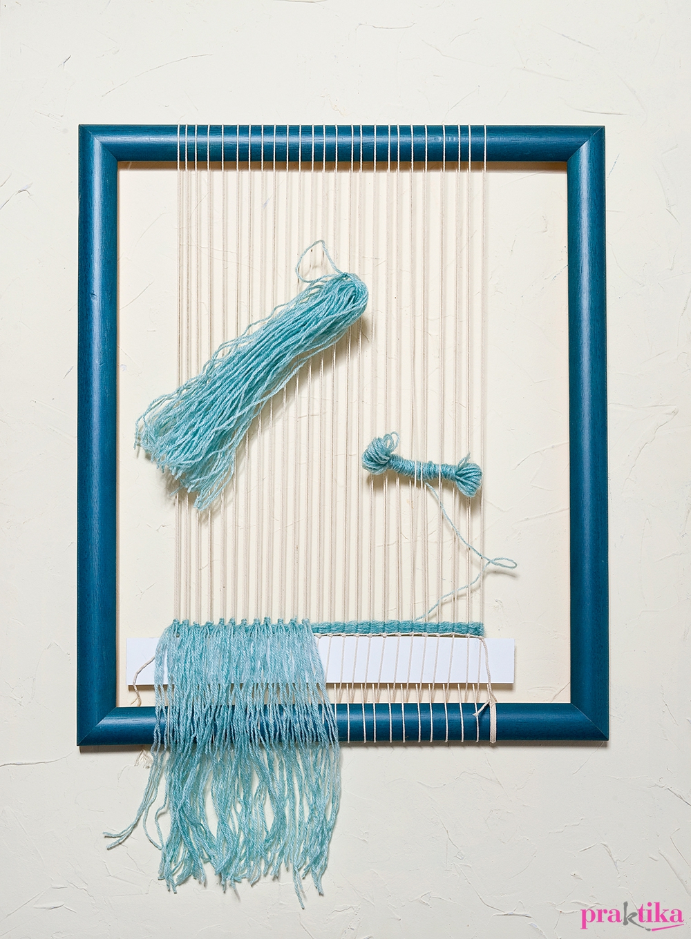 Hozzávalók • szövőkeretnek egy 50x60 cm-es képkeret • felvetőfonal • különböző vastagságú türkiz, fehér, szürkésbarna, sárga, piros, rózsaszín, bordó, lila fonalak • villa, olló • faág
