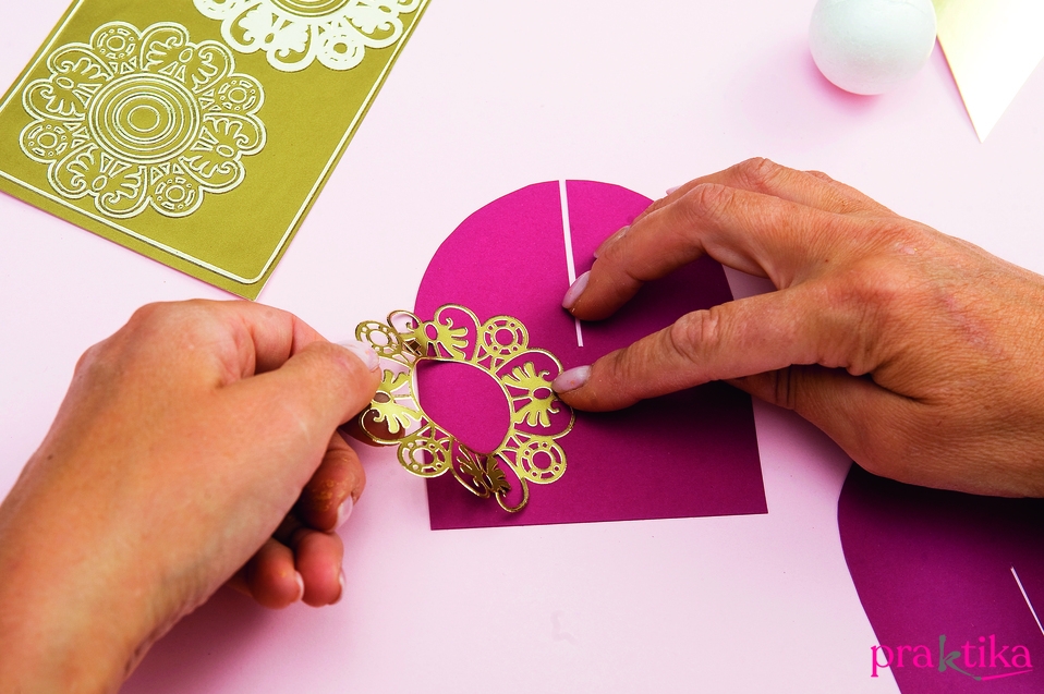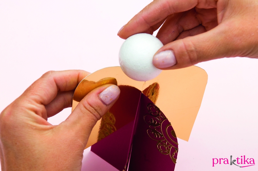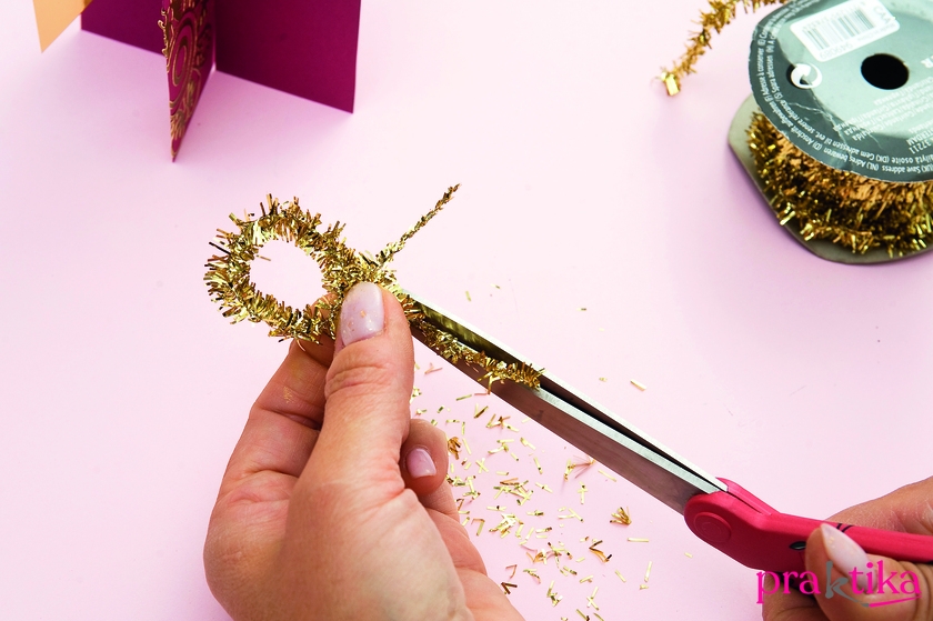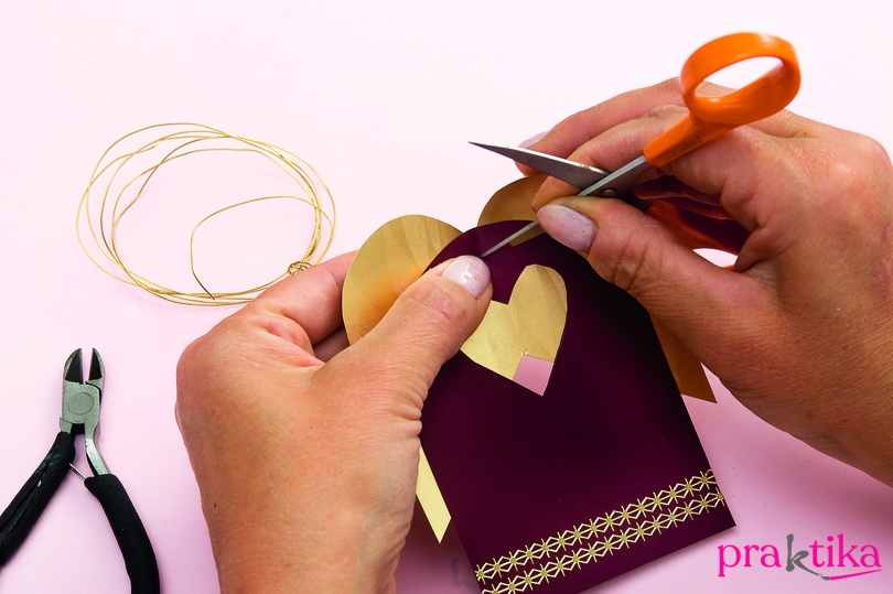 - Hegyes ollóval lyukaszd ki a test alját három helyen. Tetszés szerint vágj ki aranyszínű vagy glitteres csíkokat, és egy-egy kis drótdarab segítségével rögzítsd őket a testre. A drótdarabok végét hátul hajlítsd vissza.