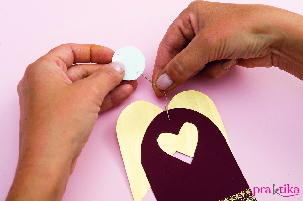 - Helyezd a szárnyra a testet, és hegyes ollóval készíts egy lyukat a „nyak” résznél. Készíts egy-egy lyukat a fej alsó és felső szélén, egymással szemben, illetve a glória felső szélén. Egy kis darab drót egyik végét bújtasd át a testen és a szárnyon, azután csípőfogóval hajlítsd vissza a végét. A másik végét bújtasd át a fej alján lévő lyukon, és hajlítsd vissza ezt is. Fűzz át a glórián és a fej felső részén lévő lyukon egy hosszabb darab drótot, hajtsd vissza az alsó felét, majd a felső feléből alakítsd ki az akasztót.