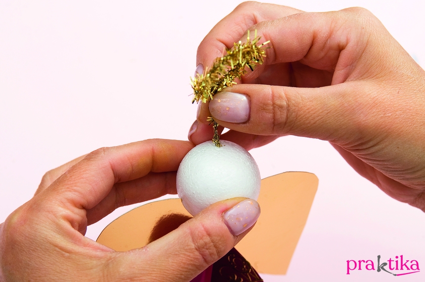- A glóriának vágj egy kb. 10 cm-es darabot az arany színű boából, csavard össze a végeit, és csupaszítsd meg. Az így kapott szárat tűzd a hungarocell fejbe.