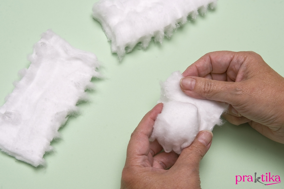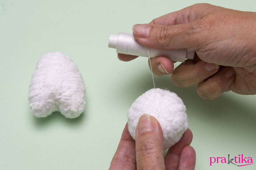 - A vattából tekerj egy kis gombócot, majd borítsd be több vékony réteggel, míg körülbelül pingponglabda nagyságú lesz. A testhez hasonlóképpen készíts egy A alakú formát. Mindkét formát sűrűn tekerd át fehér cérnával. A testnél a lábak között húzd be a cérnát.