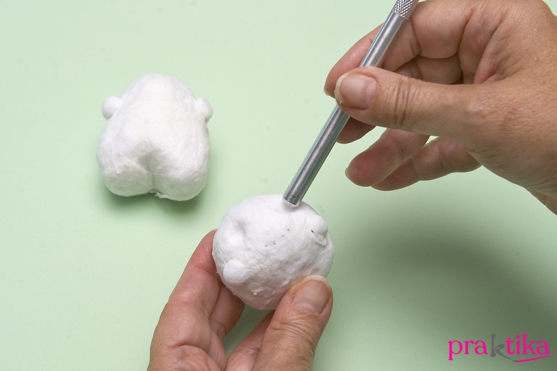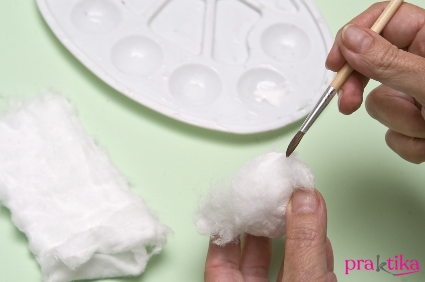 - A karokhoz gömbölyíts két pici vattagombócot. Kend be a testen a helyüket ragasztóval, majd nyomd oda a gombóckákat. Simogasd át felülről is őket, míg a félgömb forma kialakul. Hagyd száradni. Hasonlóképpen készíts két kis gombócot a fejre pofi gyanánt. Kissé nedvesítsd be az arcot, és az ujjaddal vagy egy gömbölyű végű tollvéggel nyomj két mélyedést a szemeknek a még nedves felületbe. A vattából gyúrj, pödörj egy kis répaorrot.