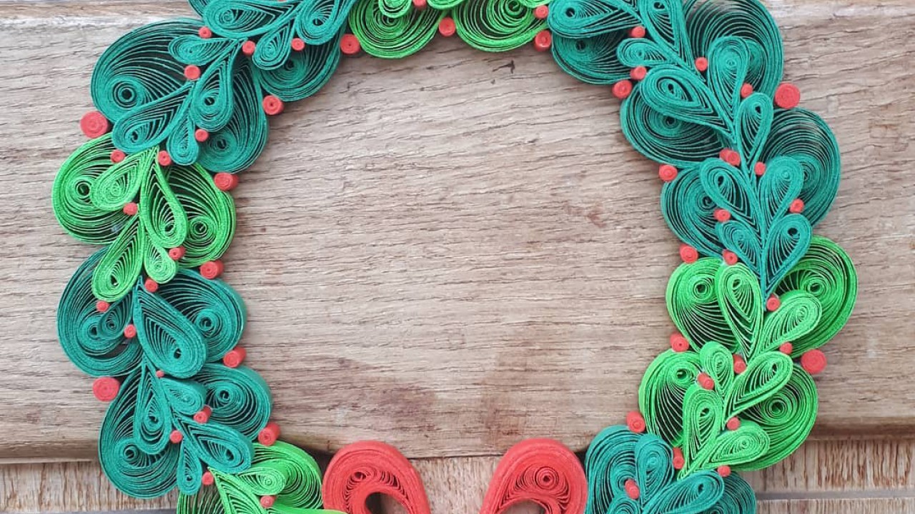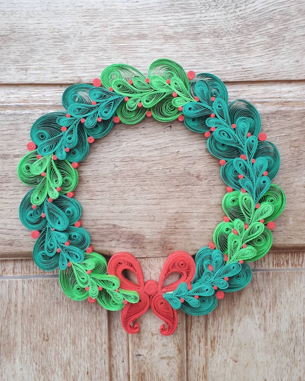 A csipkeszerű díszítőelemek szépségét az aprólékos munkával szirom- és levél formába tekert csíkok adják. A piros és a zöld színpárossal garantáltan ünnepi hangulatot áraszt az elkészült papírcsoda.