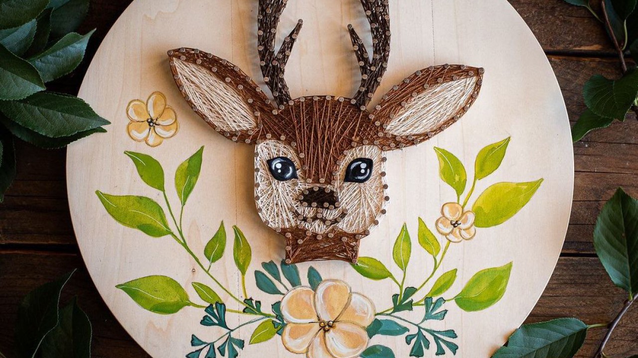 A kép hátteréül szolgáló alapot le is festheted, de a nyers fa is szépen mutat. Helyezd a sablont az alapra, majd a körvonalát rakd ki szögekkel. Távolítsd el a sablont, majd kezdődhet a hurkolás. Fonaltakarékos megoldásként hurkolhatod szellősen a mintát, de egészen sűrű szövésű képet is alkothatsz.