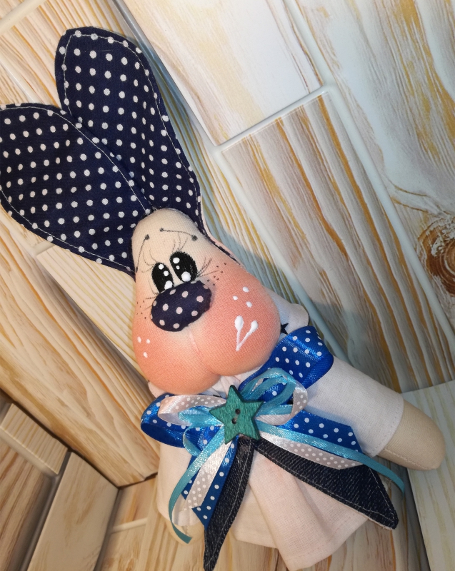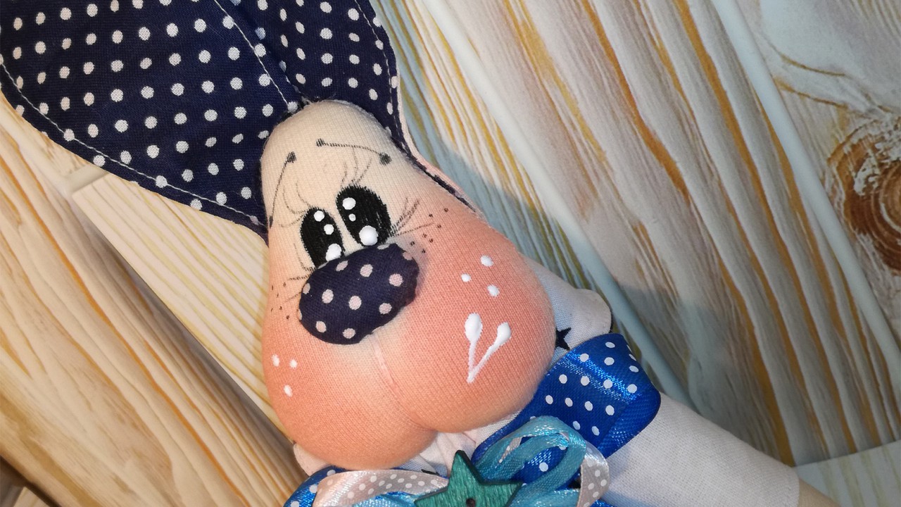 1. Válaszd ki a nyuszi testéhez és füléhez az anyagokat. Rajzold fel félbehajtott anyagra a nyuszi testét, fejét, kezeit, füleit majd a fülét és vágd ki. A mintás anyagot színt színnel szembe tedd, gombostűzd össze és így vágd ki belőle a füleket. Szabj ki az orrához egy 5x5cm-es anyagot, hajtsd félbe, majd megint félbe és vágj ki belőle egy korongot.