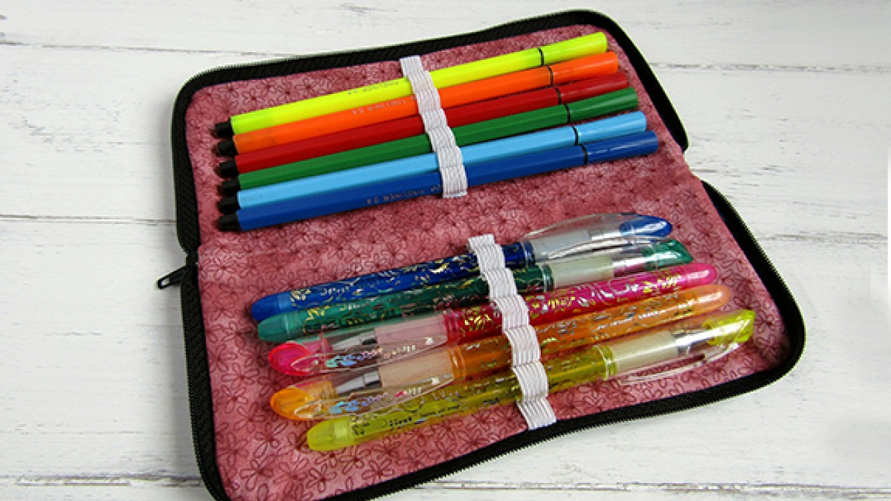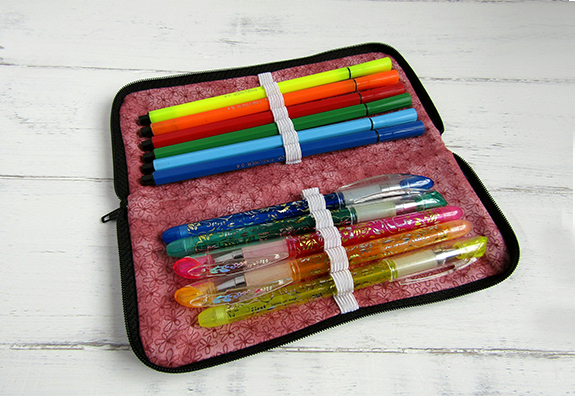 7. Az első 1cm jelzést illeszd a széléhez és varrd oda, a következő jelzés az anyag szélétől 2cm-re van. Oda varrd a gumit. A következő jelzés az anyagon 1 cm. A gumin 2 cm. A gumin lévő vonalat odailleszted az anyag jelzésére és a vonalak találkoznak. Így alakulnak ki a ceruzatartó rések a gumin. Haladj tovább, amíg el nem érsz az utolsó vonalig. Ott vissza kell hajtani a maradék 1 cm gumit és úgy levarrni.