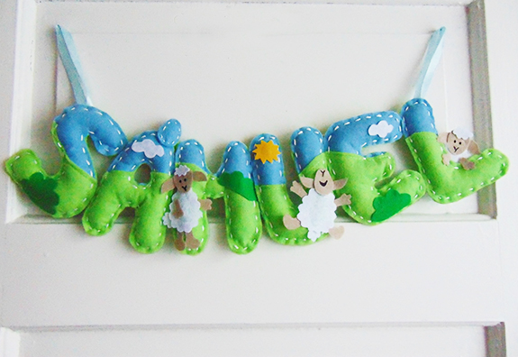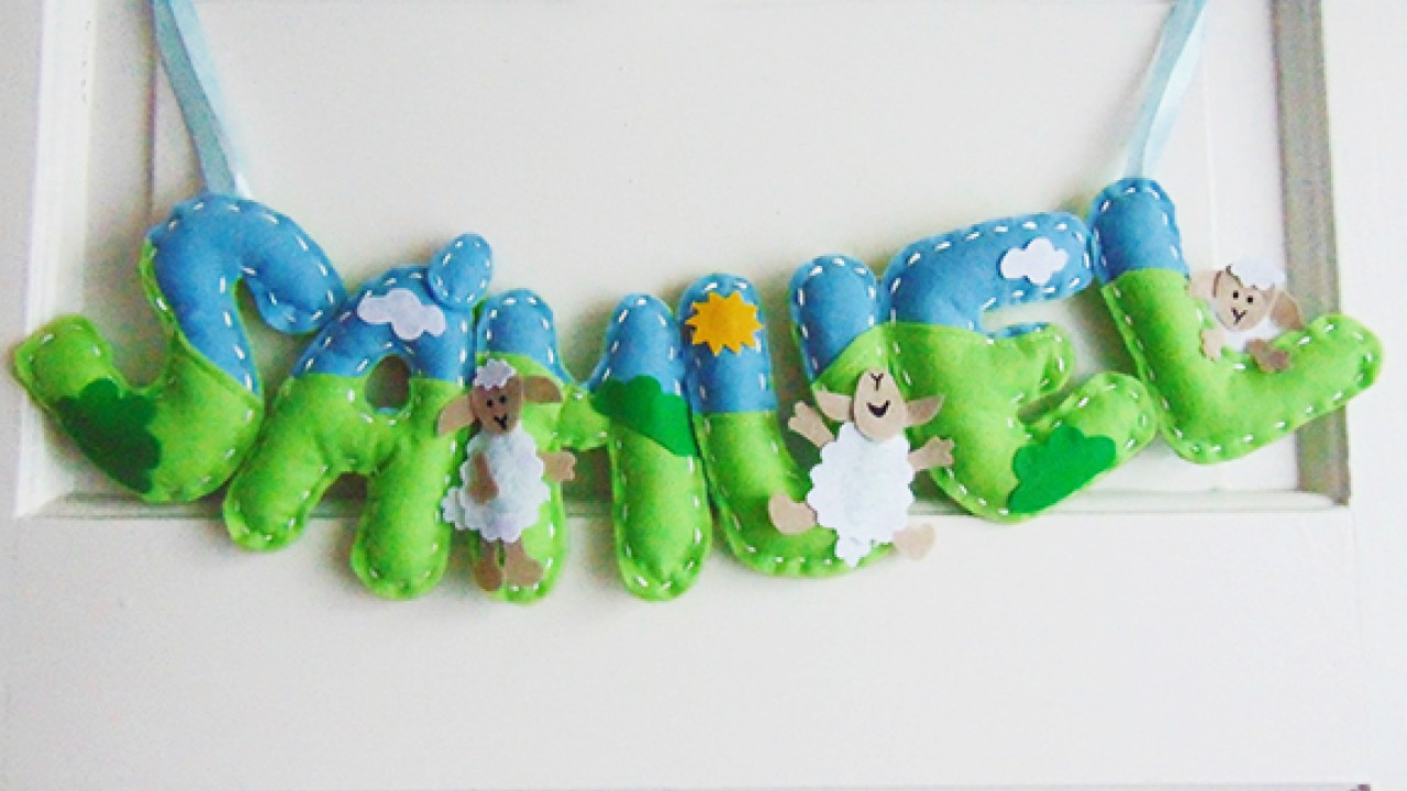 Rajzold meg a betűket papírra majd filcből vágd ki őket duplán. Gombostűzd össze a két felet és apró öltéssekkel varrd végig a betűk peremét. Hagyj rést a kitöméshez. Ha kész az összes betű, a hátoldalukon öltögesd össze őket néhány ponton. A két végére varrj selyemszalagot, ez lesz az akasztó. A különböző színű betűk magukban is jól mutatnak, de tovább díszítheted őket apró figurákkal. Vágj filcből állatkákat, virágokat és varrd azokat is a betűkre. Akrilfestékkel pedig tovább mintázhatod az elkészült tárgyat.