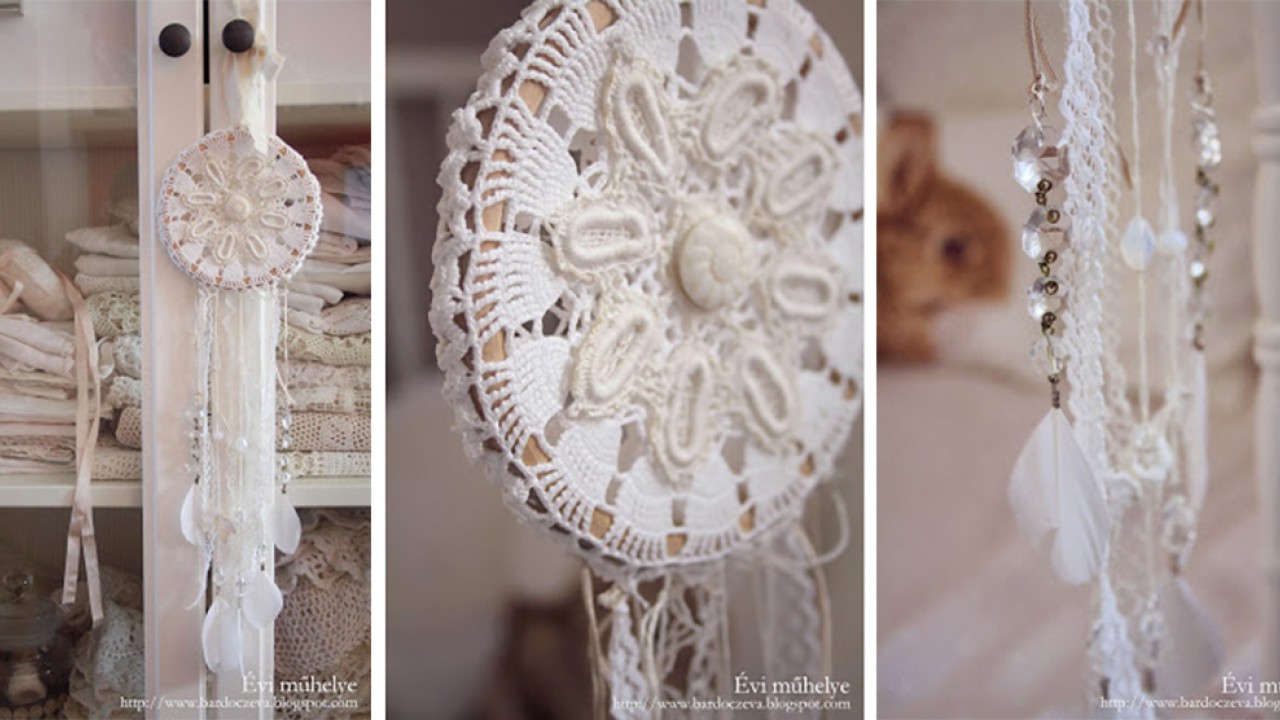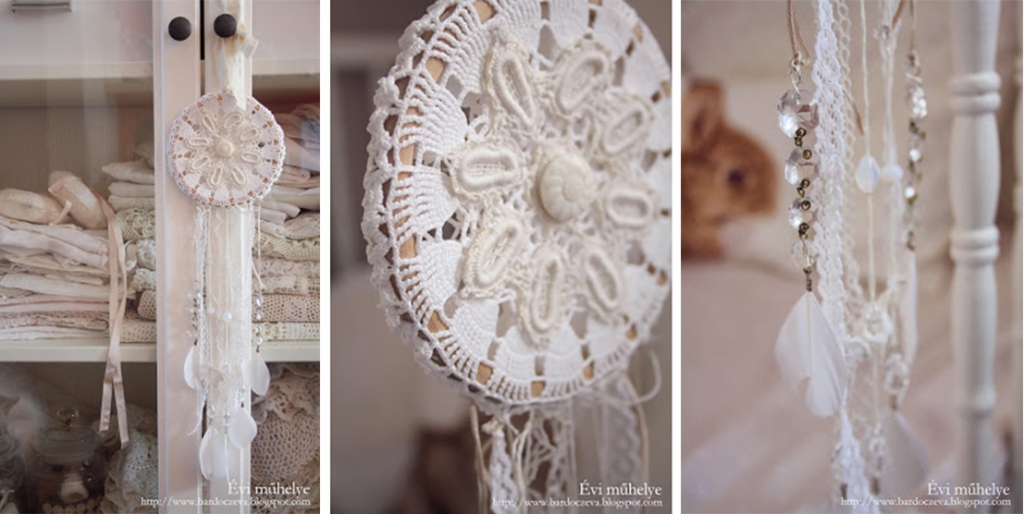 Évi elkészítette saját verzióját a gyermekeinek. A fából készült karikára régi csipkét varrt, az álomfogó alját leheletfinom csipkés szalagokkal, és tollakkal díszítette, amire átlátszó üvegkristályokat fűzött. A hófehér, romantikus dísz biztosan szép álmokat hoz a gyerkeknek és dekorációnak is csodás. Készíts egyet te is!