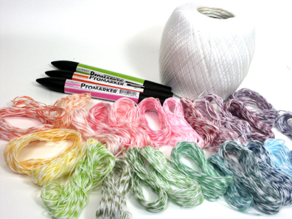 A vonalzót borítsd be a maszkolószalaggal mindkét oldalán. Tekerd a fonalat szorosan egymás mellé a vonalzóra és rögzítsd a végeket. A filctollal húzz vonalakat keresztben a fonalra a vonalzó mindkét oldalán. Lassan, hogy kellően átitassa azt. Hagyd száradni és tekerd le. Használhatod csomagoláshoz, albumkészítéshez és más kreatív technikákhoz.
