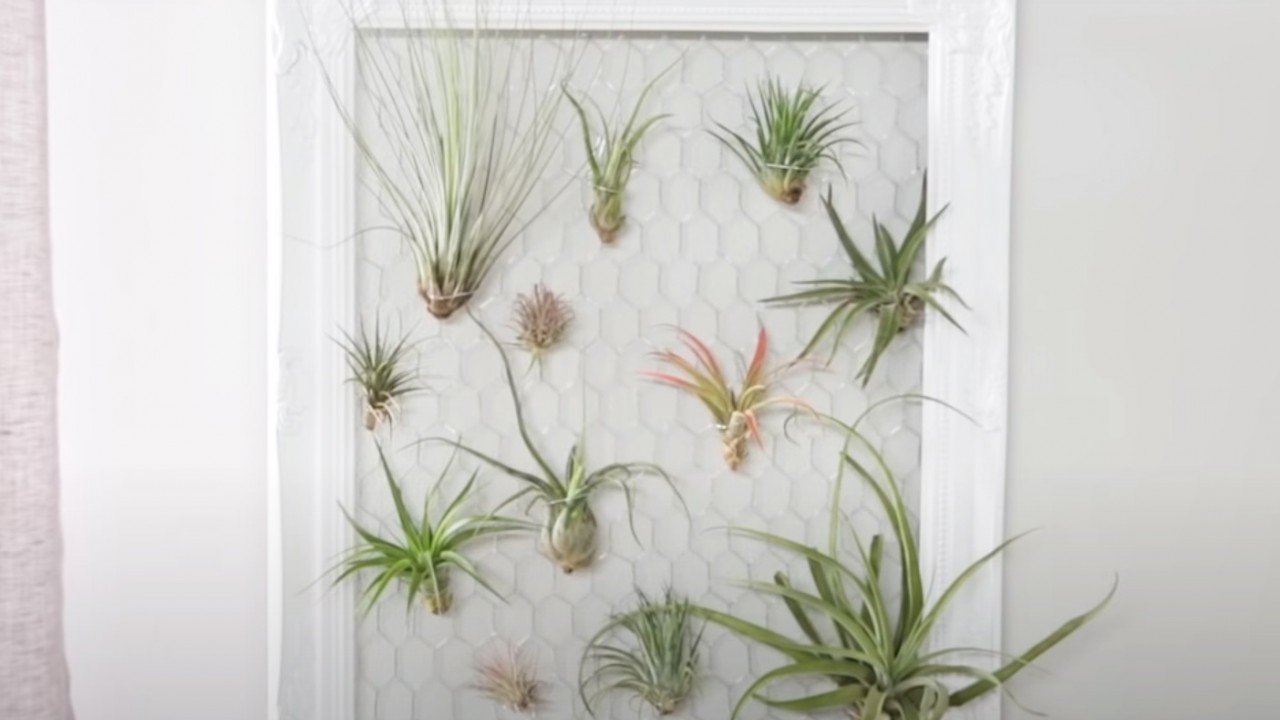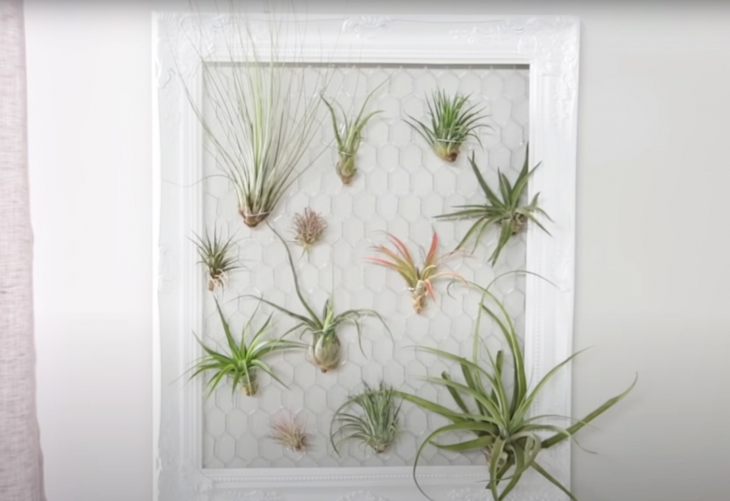 Egy díszes képkeret mögé húzz csirkehálót és rögzítsd szorosan. Végül tegyél a lyukakba szakállbroméliát, amelynek még csak talajra sincs szüksége a növekedéshez. Így akaszd fel a falra.