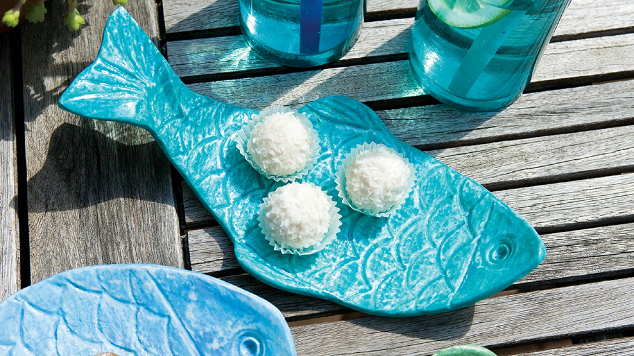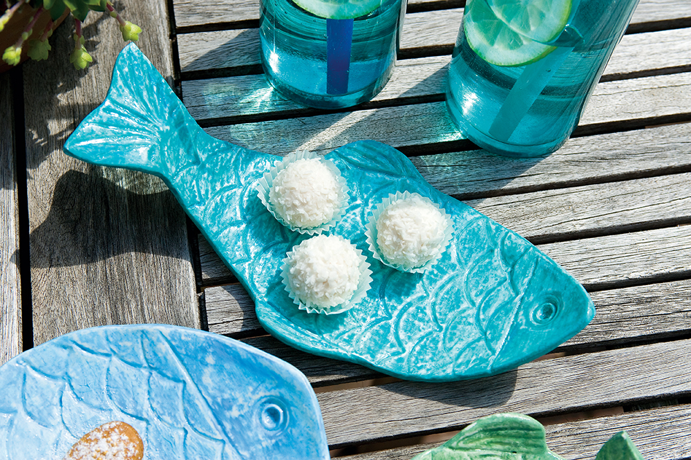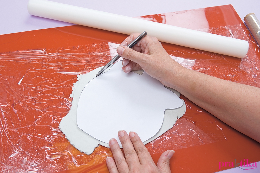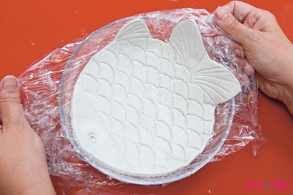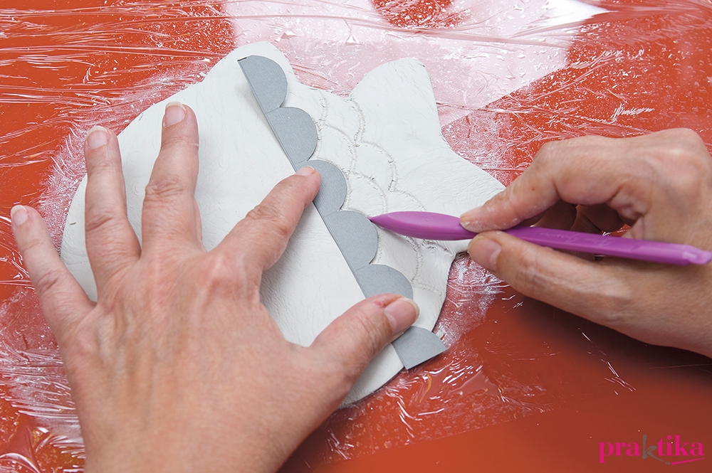 Rajzold meg és vágd ki a hal formákat papírból, a pikkelymintát kartonból. Vágj egy darab folpackot, terítsd le vele a nyújtólapot. Nyújts ki egy darab gyurmát kb. fél cm vastagra, helyezd rá a papírhalat és vágd körbe sniccerrel. Helyezd a hal farkához a pikkelysort, és egy tompa végű eszközzel, tollvéggel karcold a mintát a gyurmába. Haladj előre a fej felé, és ott húzz egy egyenes határvonalat. A szemhez való gombot nyomd bele a megfelelő helyre.