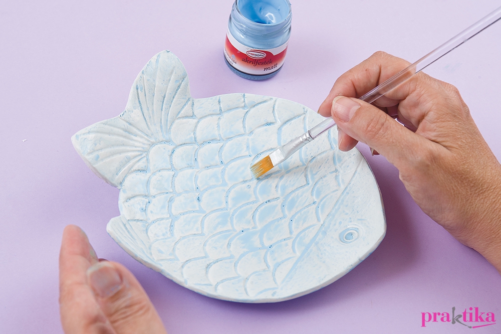 Helyezd át a gyurmahalat a folpackkal együtt egy megfelelő méretű tányérba. Ez adja meg majd a tálka homorú alakját. Hagyd száradni, míg teljesen kemény és formatartó lesz. Ez két napig is eltarthat. Lakkozd le a tálkát két rétegben. Így nem szívja majd be a festéket és porcelán hatású lesz. A lakk száradása után hígabb festékkel kend át a tálkát, ha kell többször. Végül két réteg lakkal zárd.