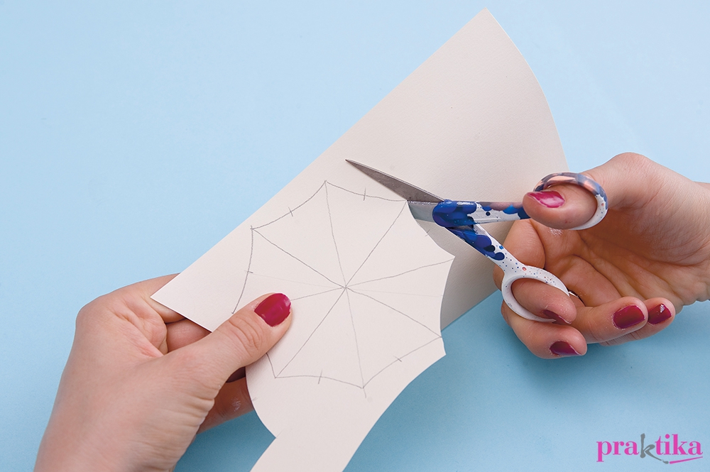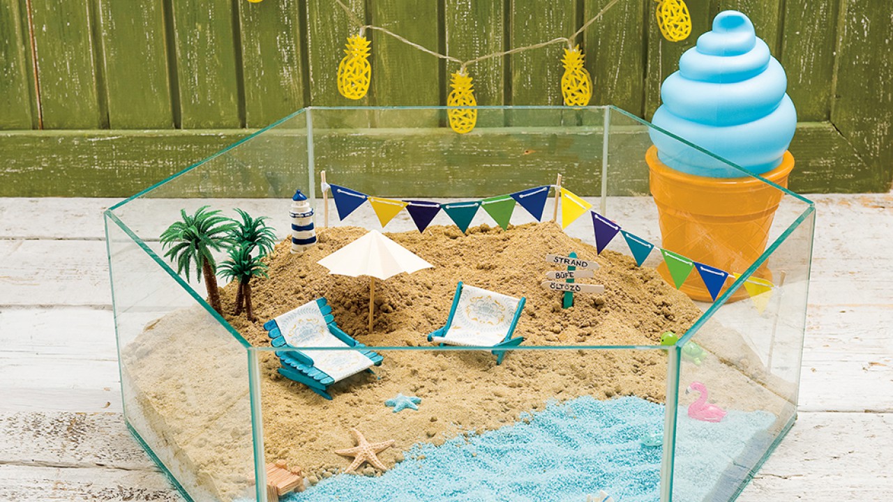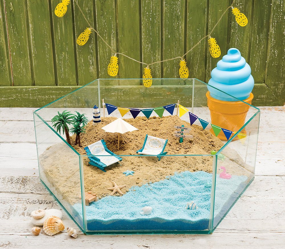 Az esernyőformát vágd ki vajszínű kartonpapírból. A hajtásoknál bígeld be, hajtsd meg, és melegragasztóval fixáld a belsejében a hurkapálcát. Zászlócskákat is készíthetsz színes papírokból: vágj ki háromszögformákat, lyukaszd ki őket és fűzd fel madzagra. Az akváriumba tegyél homokot, majd rendezd be. Ha a napernyőd nem akarna megállni, akkor nyomkodd egy kis darab gyurmába, úgy helyezd a homokba.