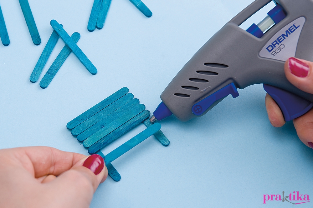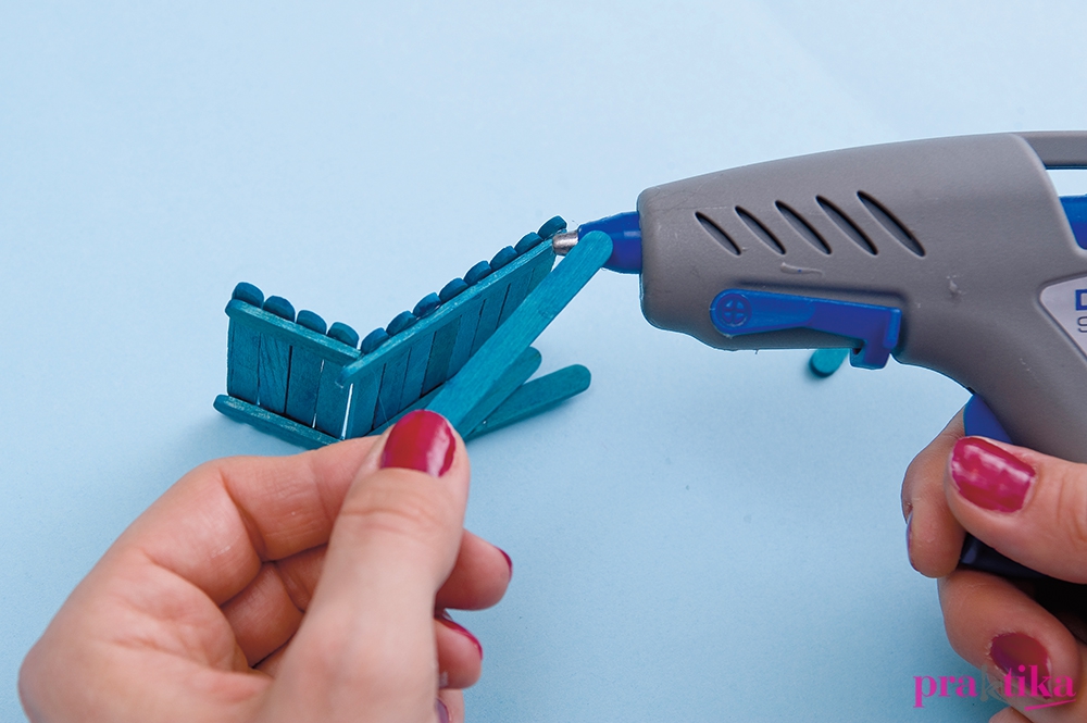 A napozóágy megépítéséhez két, egymástól egy spatulányi távolságban lévő lapocskára ragassz fel keresztben annyi spatulát, amennyi ráfér, ez lesz a fekvőfelület. A háttámlához vágj félbe egy spatulát, és a két felet is tedd egy spatulányi távolságra egymástól, és erre is ragassz végig további darabokat. Megdöntve fixáld melegragasztóval a fekvőfelületen. A fekvőfelület aljához két oldalra ragassz fel, két egymást keresztező spatulát, ezek lesznek a lábak.