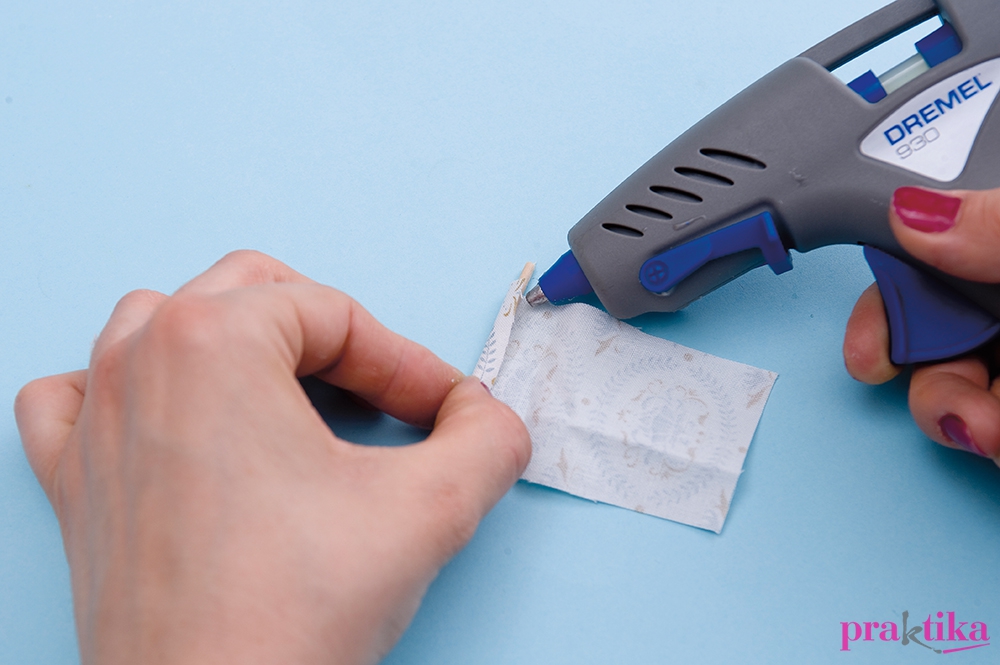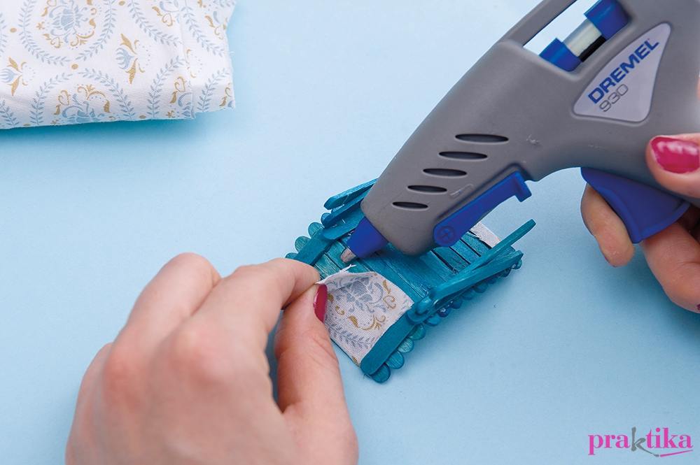 A mintás textilből szabj le a spatula hosszúságánál két cm-rel rövidebb csíkot, és melegragasztó segítségével dolgozd rá az ágyra úgy, hogy az alján visszahajtod az anyagot.