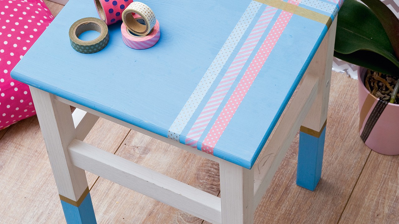 Szinte öt perc alatt teljesen új külsőt varázsolhatsz bútoraidnak dekortapasszal. Fesd le a natúr hokedli lábait fehérre, az ülőlapját pedig világoskékre a víz bázisú zománcfestékkel két rétegben, majd a száradás után a lábak alját 15 cm magasságig fesd világoskékre. Ha megszáradt a festék, akkor jöhet a tapaszdekor: tekerd vele körbe a bútordarabot ízlésed szerint. Kattints ide, ha megnéznéd az elkészítés teljes folyamatát!