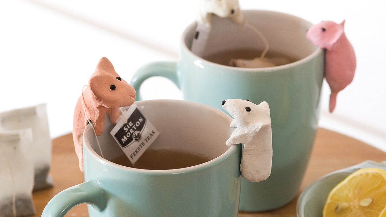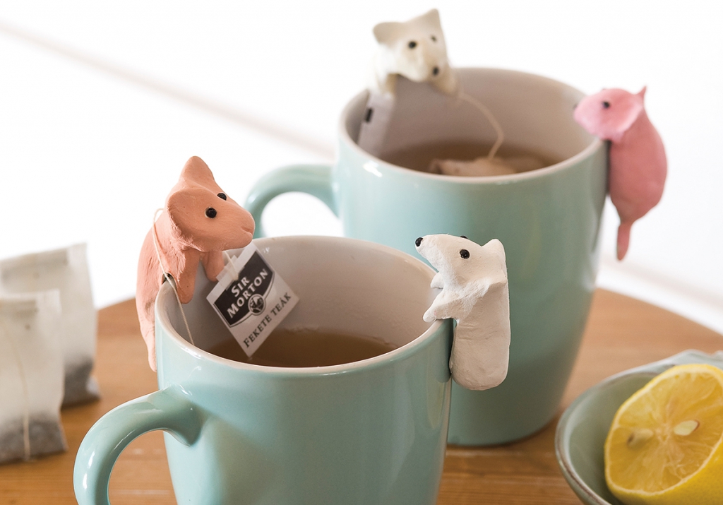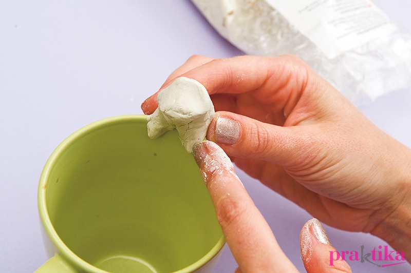 Egy kb. diónyi mennyiségű gyurmát tapassz a bögre felső peremére. Alakítsd ki a fejet, úgy, hogy felfelé kezdd elnyújtani, majd hajlítsd a pohár belseje felé. Tapassz a fej két oldalára még egy kevés gyurmát és alakítsd ki belőlük a füleket. A testen két oldalt tapassz még hozzá gyurmát, és alakítsd ki a kapaszkodó mancsokat. Egészen hajlítsd be őket a bögre belsejébe, hogy stabilan megálljon a figura a bögrén.