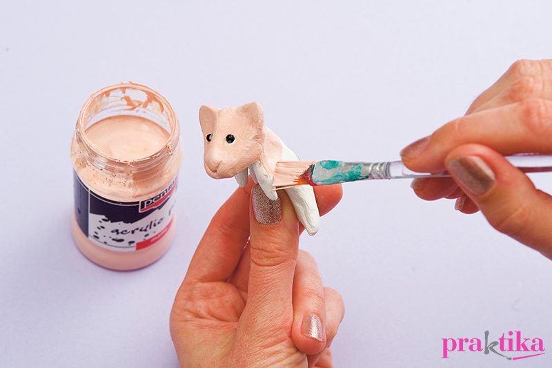 A szemek helyét jelöld ki a tűvel, majd illeszd bele a gyöngyöket. Ha süthető gyurmát használsz, akkor üveggyöngyöt tegyél a szemek helyére, ami nem olvad meg. Jó megoldás az is, ha a már kész figuráknak melegragasztóval ragasztasz gyöngyszemeket. Száradás (vagy kisütés) után fesd le a figurákat akrilfestékkel, végül lakkozd át.