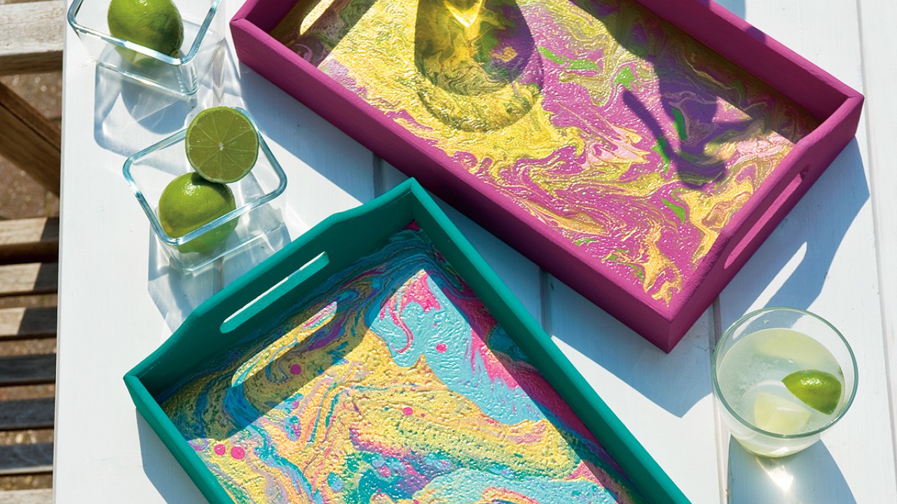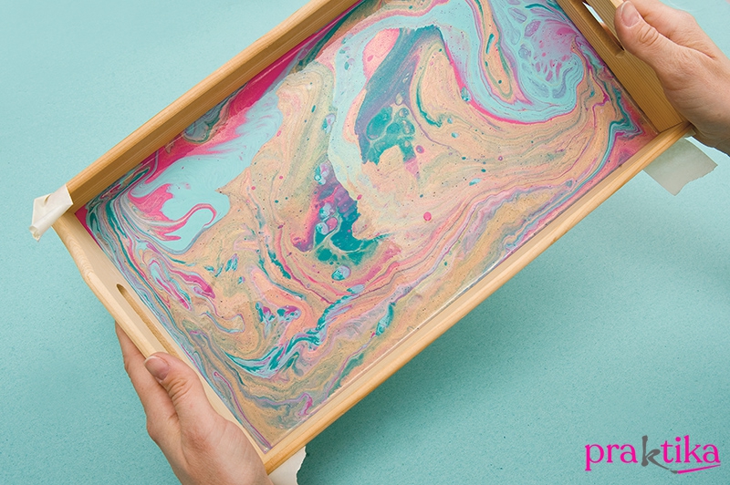 Tedd a pohárra a tálcát, majd fordítsd meg az egészet, és lassan emeld fel a poharat a tálcáról. Döntsd meg a tálcát és folyasd a festéket az oldaláig és a sarkokba. Spatulával vagy festőkéssel igazíthatod a festéket, és cseppenthetsz is bele pár pluszpöttyöt.