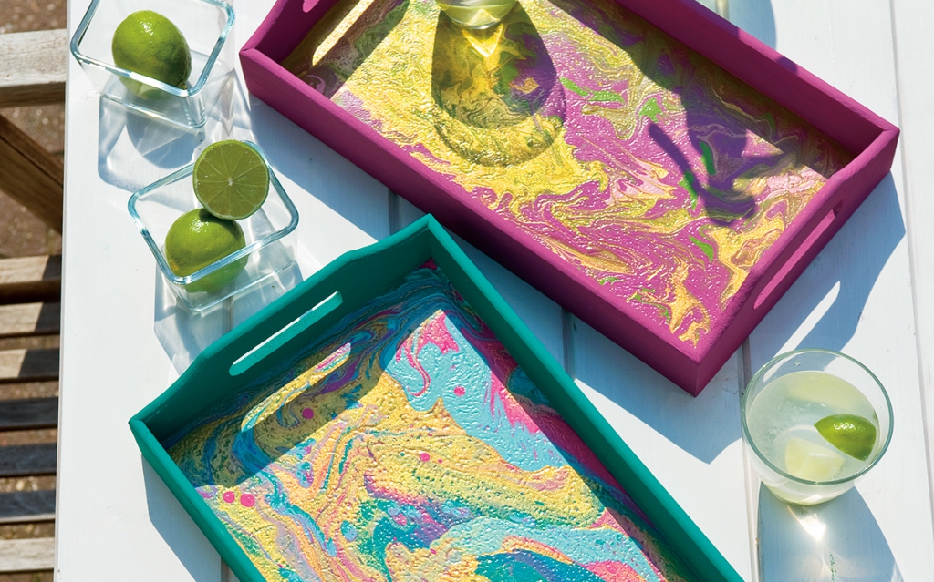 Hozzávalók • fatálca • akrilfestékek • szilikonolaj • pouring medium – akrilfesték-hígító • eldobható poharak, spatula, ecset