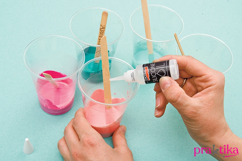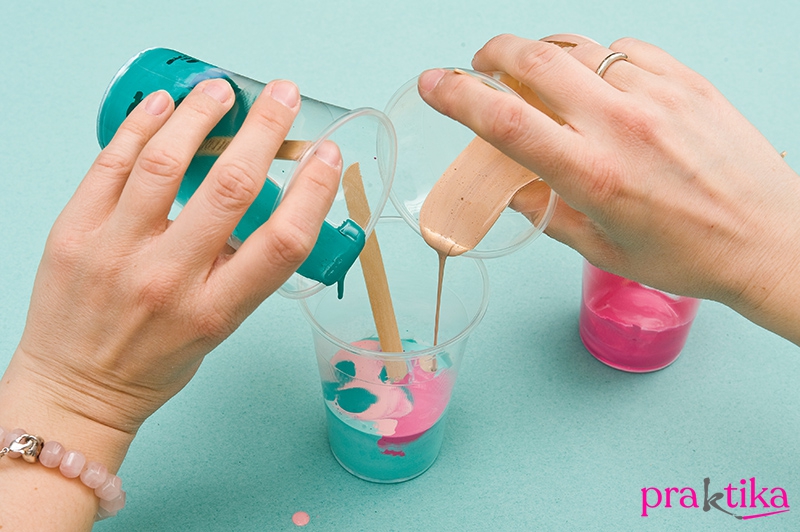 Eldobható poharakban spatula segítségével keverj össze 1-1 arányban akrilfestéket és akrilhígítót. A hígítótól a festék színe ugyanolyan marad, de az állaga folyósabb lesz.