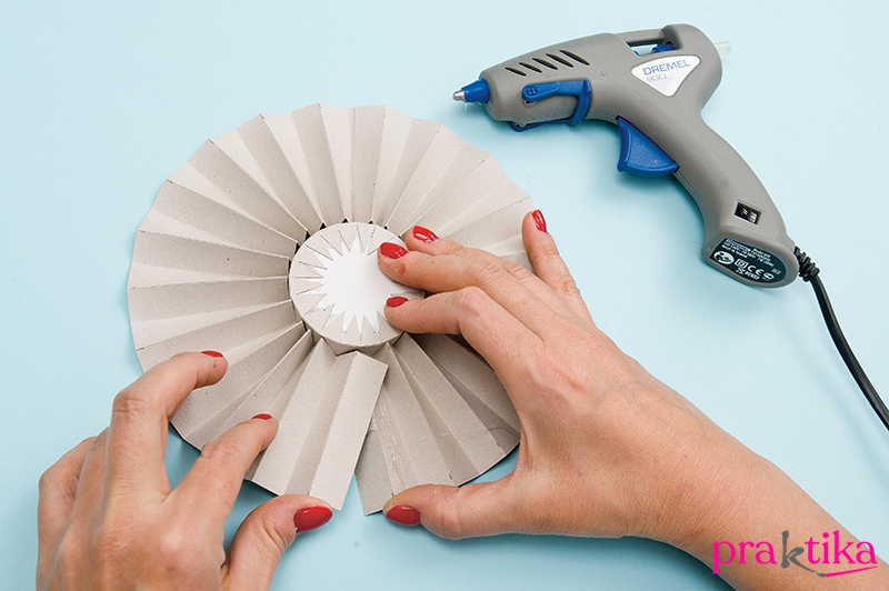 3. Tedd le fejjel lefelé a középrészt, illeszd köré a harmonikát, fényes felével lefelé és bőven megragasztózva rögzítsd azt a középrészhez.