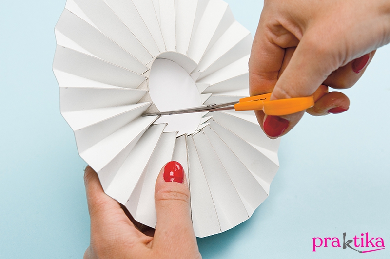4. Fordítsd színére a formát, és egy hegyes végű ollóval vágd ki a középrész oldalából a háromszögeket. Egy 5x70 cm-es csíkkal keretezd az öntőformát.