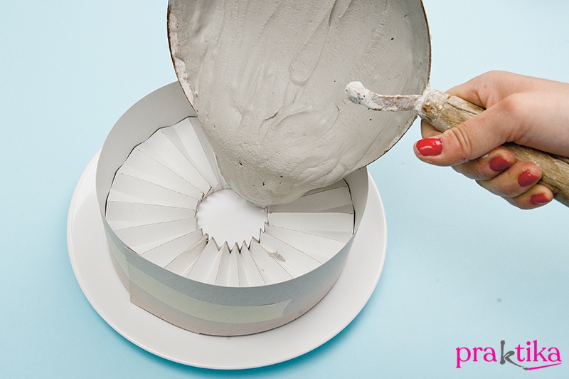 5. Önts egy keverőtálba kb. 4 dl vizet, és keverj hozzá annyi gipszet, hogy híg masszát kapj. Gyorsan öntsd a formába, majd kocogtasd meg a forma oldalát, hogy a gipsz szépen elterüljön, és a levegőbuborékok a felszínre jöjjenek. Hagyd egy napon át száradni.