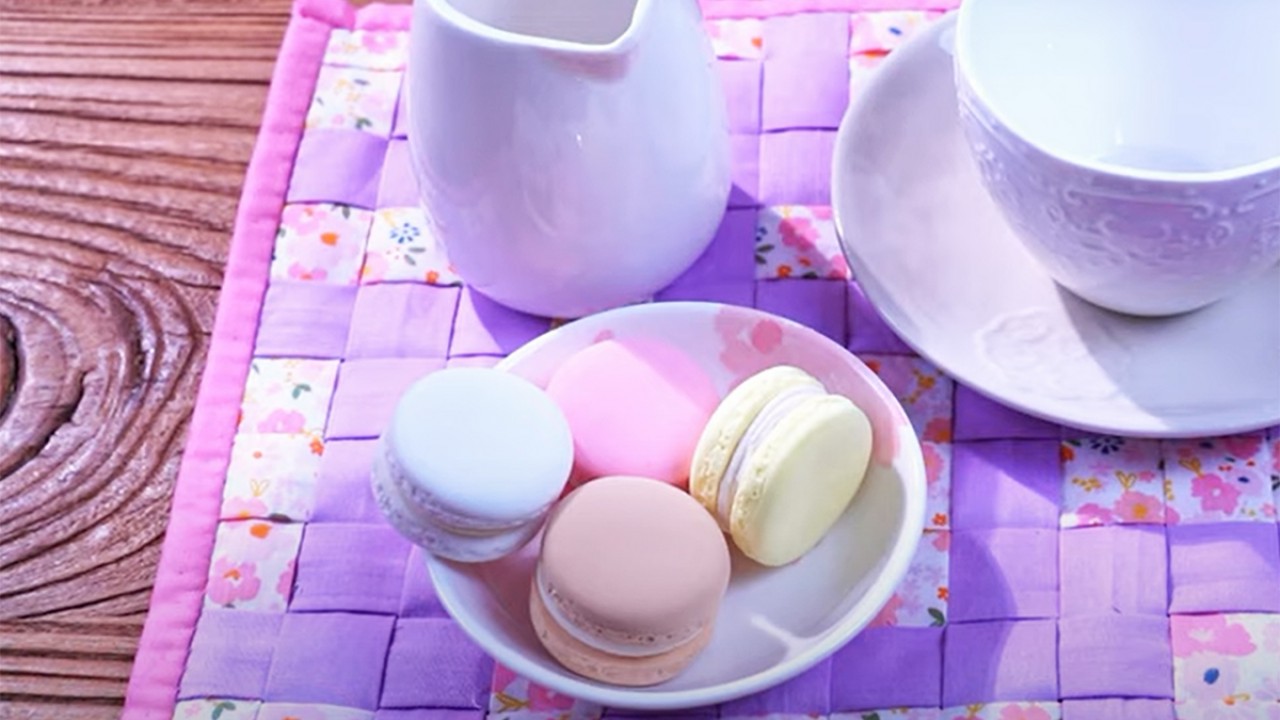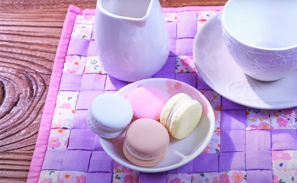 Az alátét alapjához egy nagyobb méretű, négyzet alakú textilre van szükséged. A kisebbekből varrj hosszúkás csíkokat. Egy sornyit rendezgess el a videón látható módon és a végüket varrd az alaphoz. A maradék csíkokat fűzd a többi közé keresztben, mintha szőnél. A végüket vágd egyenesre, hajtsd rá az alap behajtogatott szélét és varrd le.