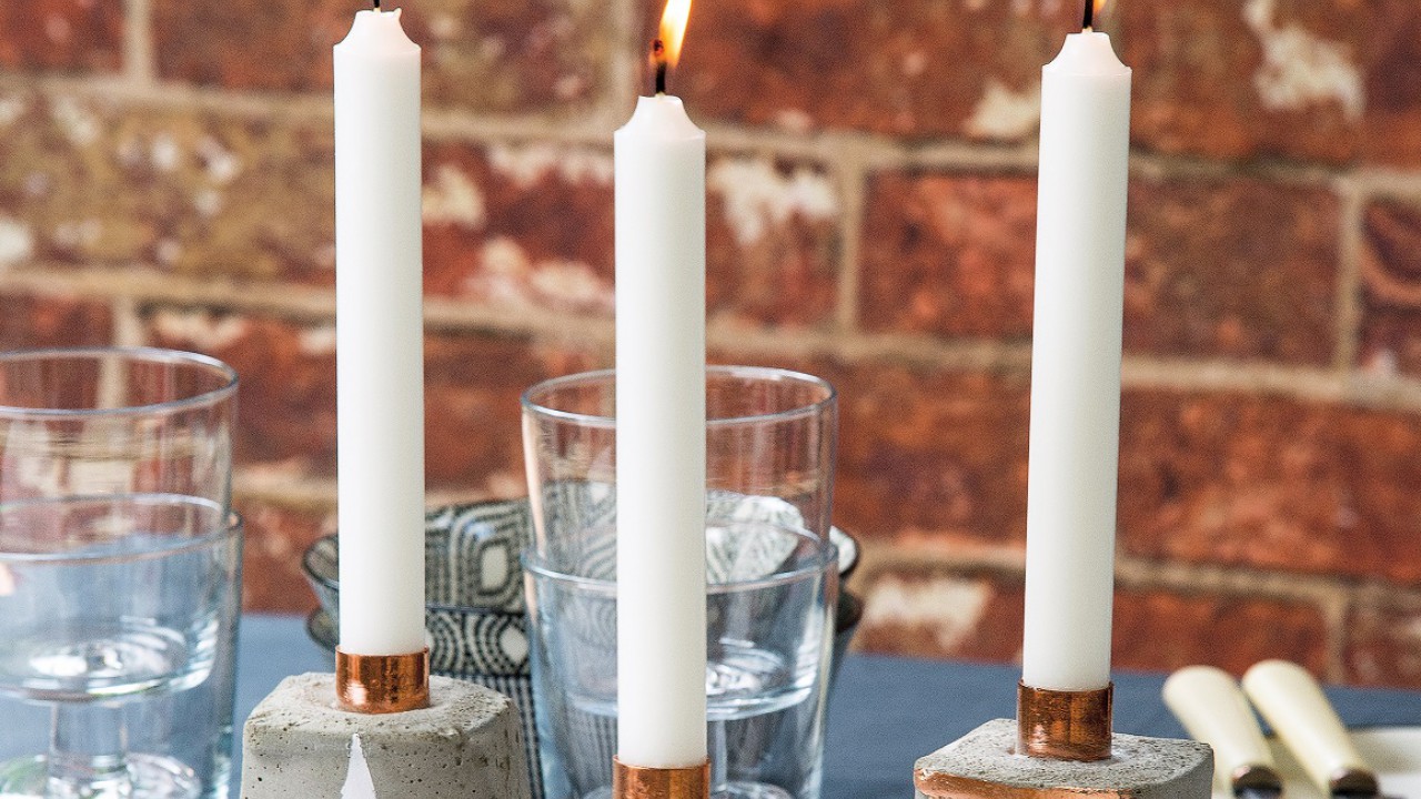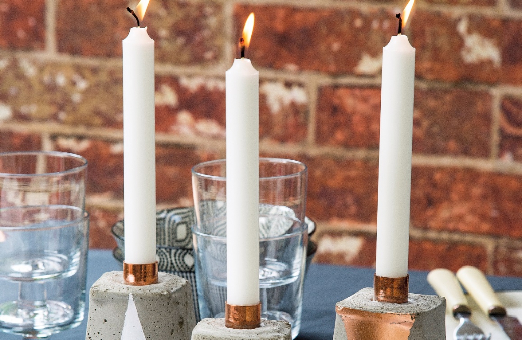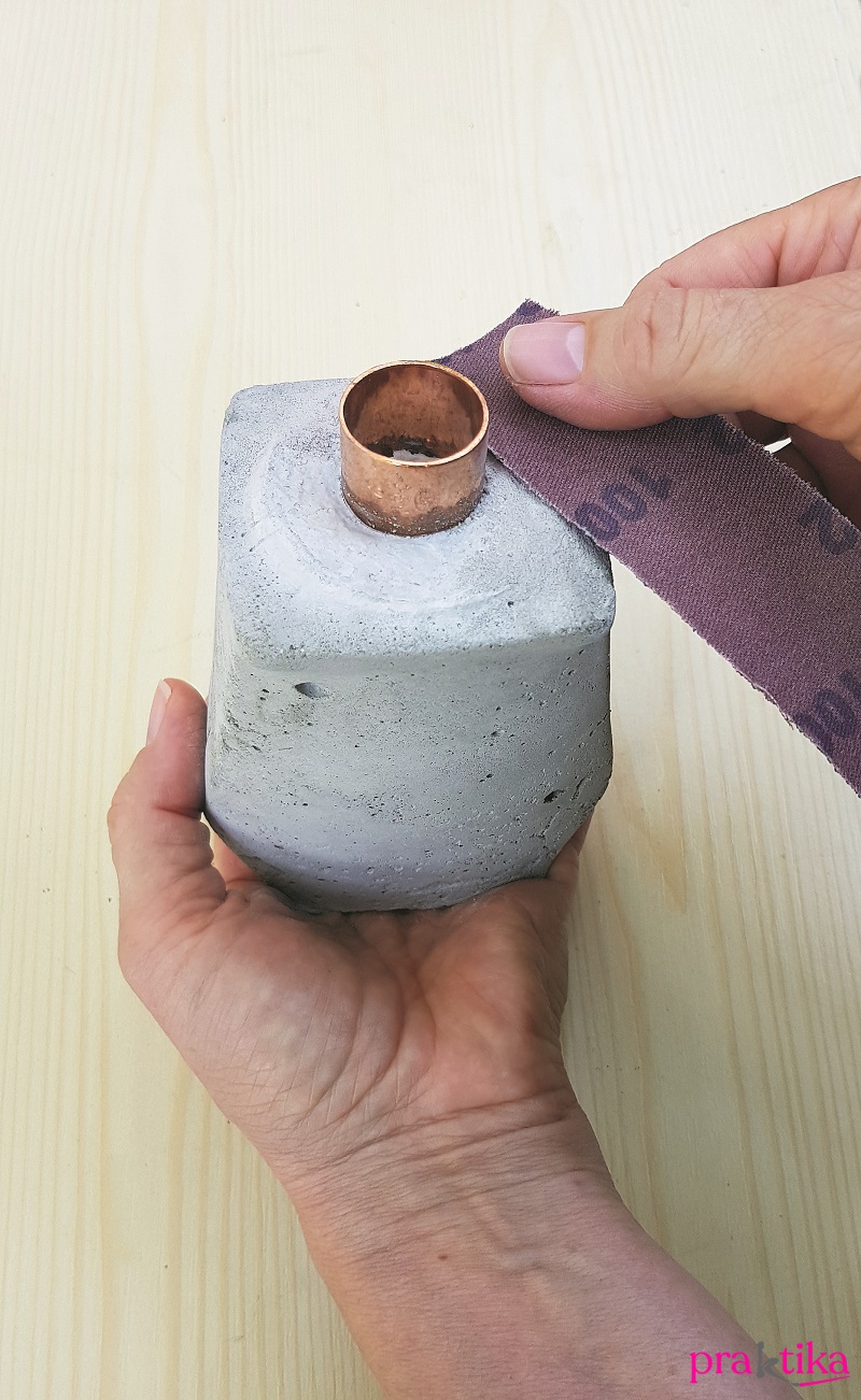3. A rézgyűrűk körül csiszold vízszintesre mindhárom beton gyertyatartó tetejét. Száraz ecsettel portalanítsd is a felületüket, hogy jól tapadjon a ragasztó és a festék.