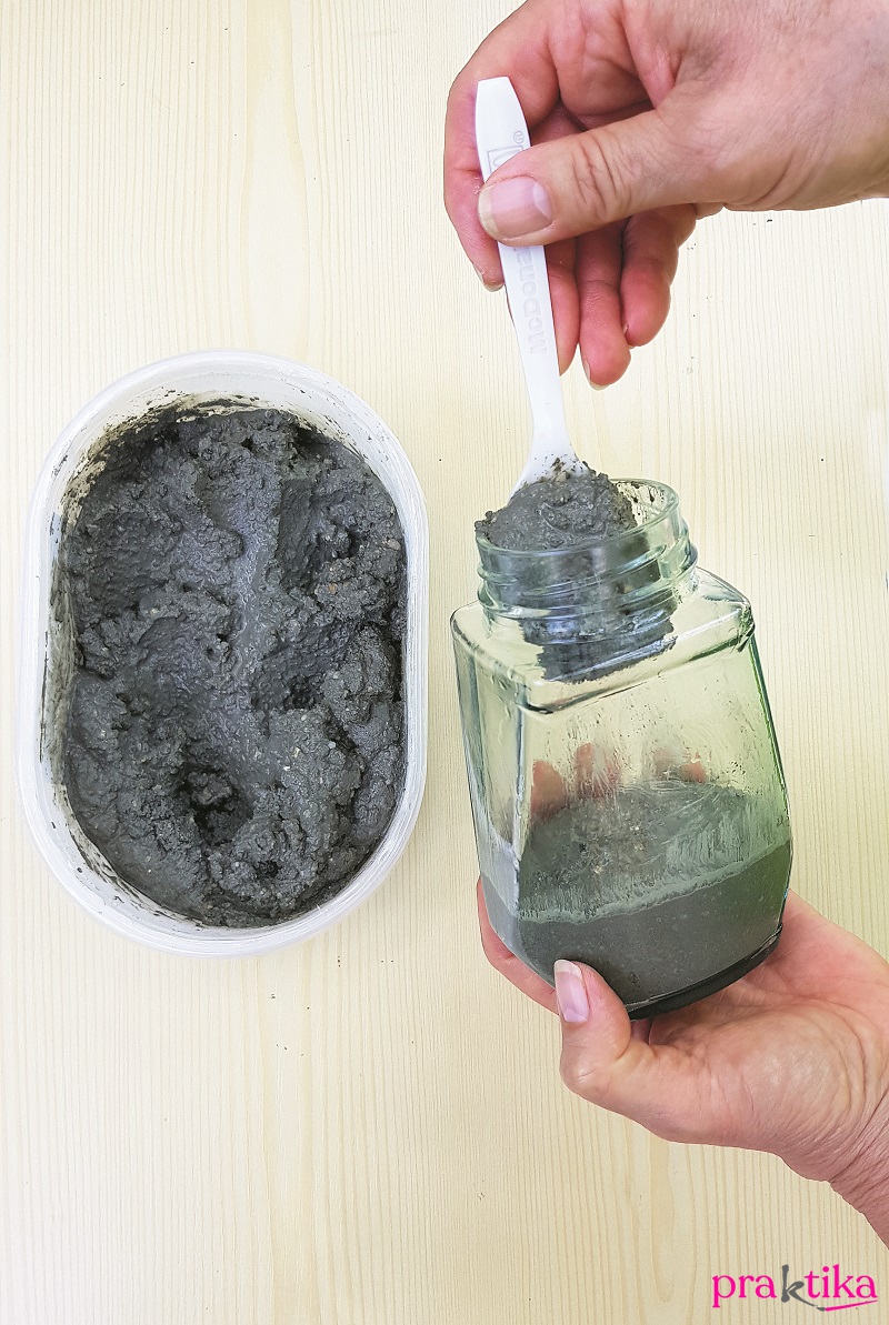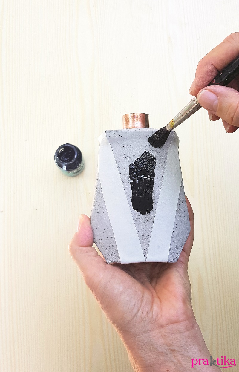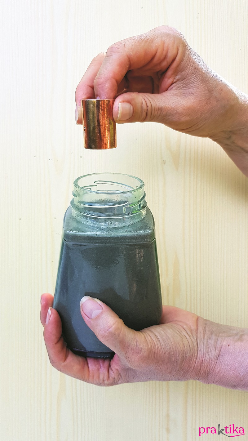 Hozzávalók • 3 db szögletesen lapolt formájú, kiürült decaf instant kávés üveg • kreatív hobbibeton • fekete és fehér akrilfesték • bronzszínű füstfólia és ragasztó • 3 db vörösréz karmantyú, Ø 22 mm • olaj, ecset • kalapács, védőkesztyű • keverőtál, kanál • csiszolóvászon