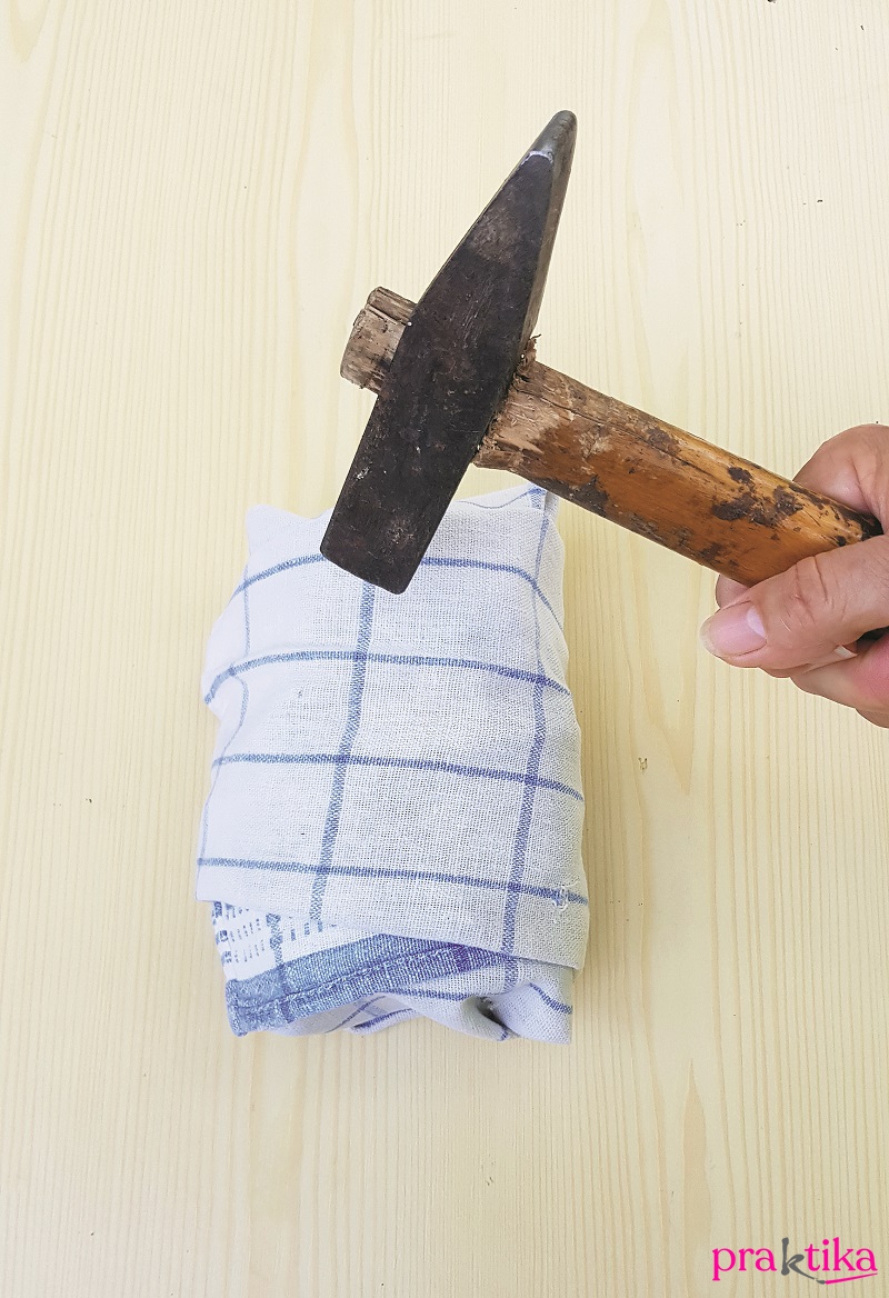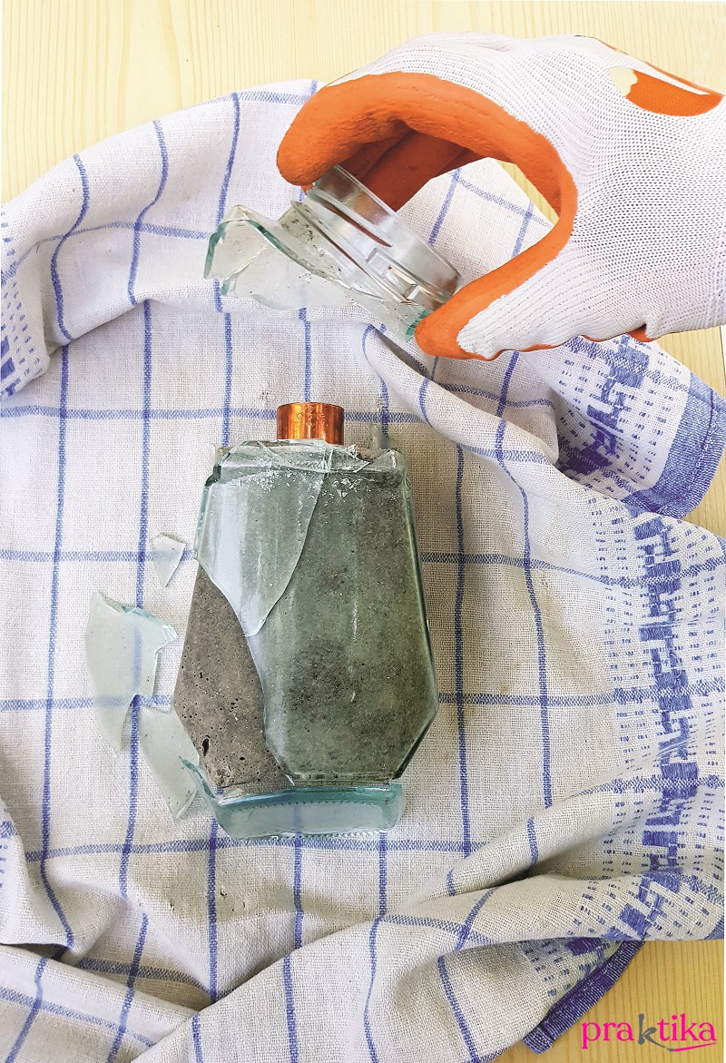 2. Hagyd kötni a betont legalább egy éjszakán át, majd alaposan csomagold be textilbe az üvegeket. Kalapáccsal kocogtasd meg a felületüket, hogy megrepedjenek – tapasztald ki, milyen erősen kell ütnöd, hogy a betont ne sértsd meg. Nyisd szét a textilt, és védőkesztyűben vedd le óvatosan a betonformáról az üvegcserepeket.